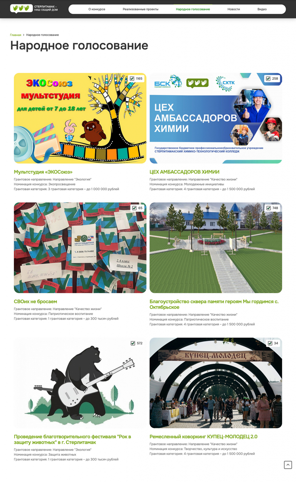 В этом разделе представлены проекты, которые были поданы на конкурс и прошли первичный отбор. Каждый проект представлен в виде карточки, включающей фотографию, краткий заголовок и ссылку на подробное описание. Это позволяет пользователю быстро ознакомиться с каждой идеей и получить более детальную информацию о ней.