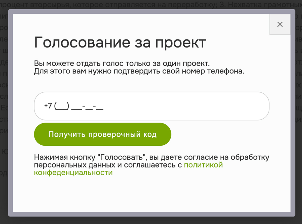 После запуска голосования, на каждом проекте появляется кнопка, с помощью которой гости сайта могут проголосовать за понравившийся проект. Голосование осуществляется через SMS-форму, что делает процесс удобным и доступным для широкой аудитории. Этот механизм позволяет всем желающим поддержать проекты, которые, по их мнению, будут наиболее полезны и важны для развития города.
