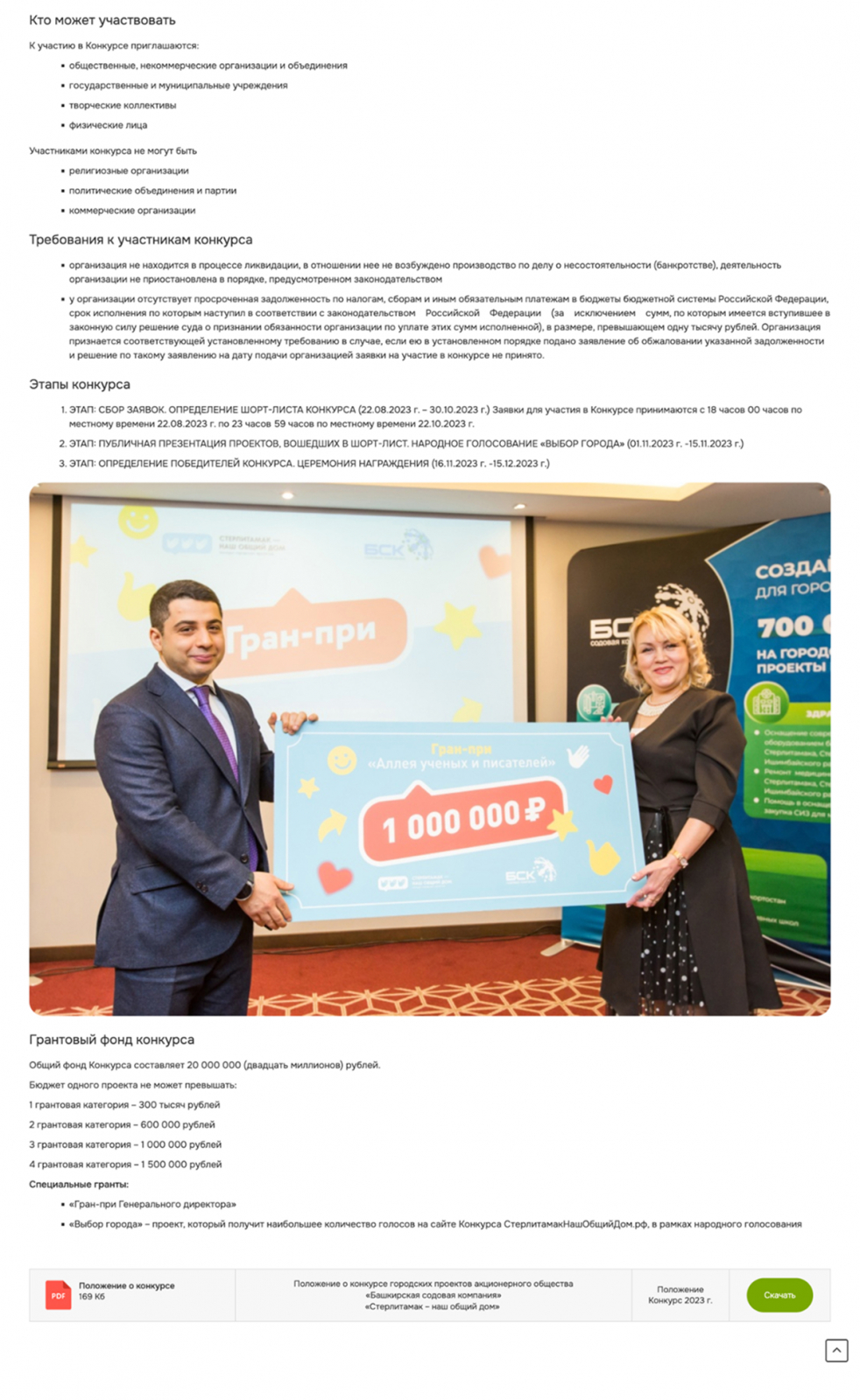 Выделены этапы конкурса, начиная от сбора заявок до подведения итогов. Указан общий грантовый фонд с подробным распределением по категориям.