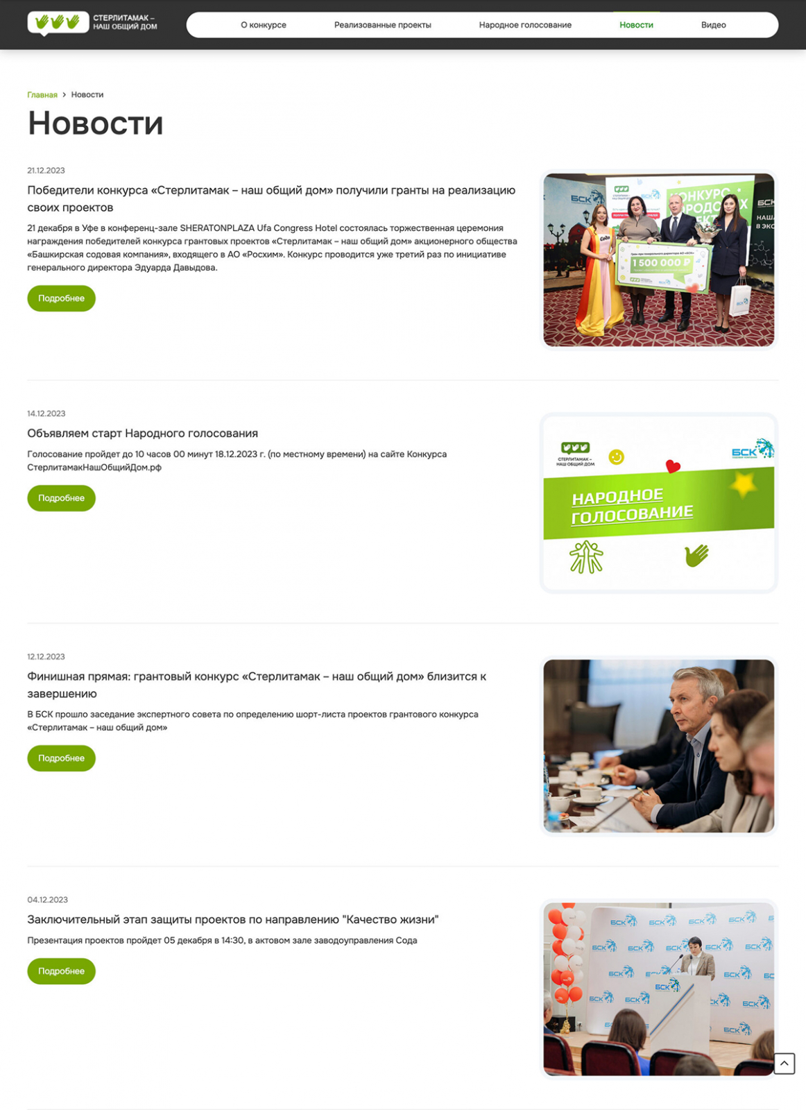 Раздел содержит актуальные события и обновления конкурса. Каждая новость представлена в удобном формате: дата публикации, заголовок, фото, краткое описание и ссылка для детального просмотра.