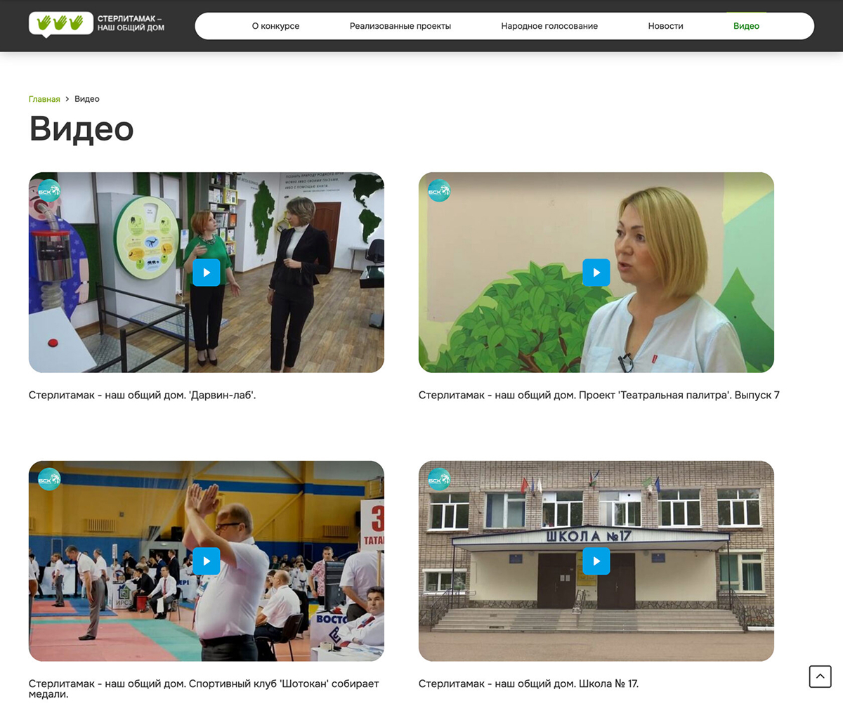 Страница представляет подборку видеоматериалов о реализованных проектах конкурса. Каждое видео сопровождается заголовком и окном для просмотра. Удобный формат позволяет легко выбрать интересующий материал и посмотреть его прямо на странице.