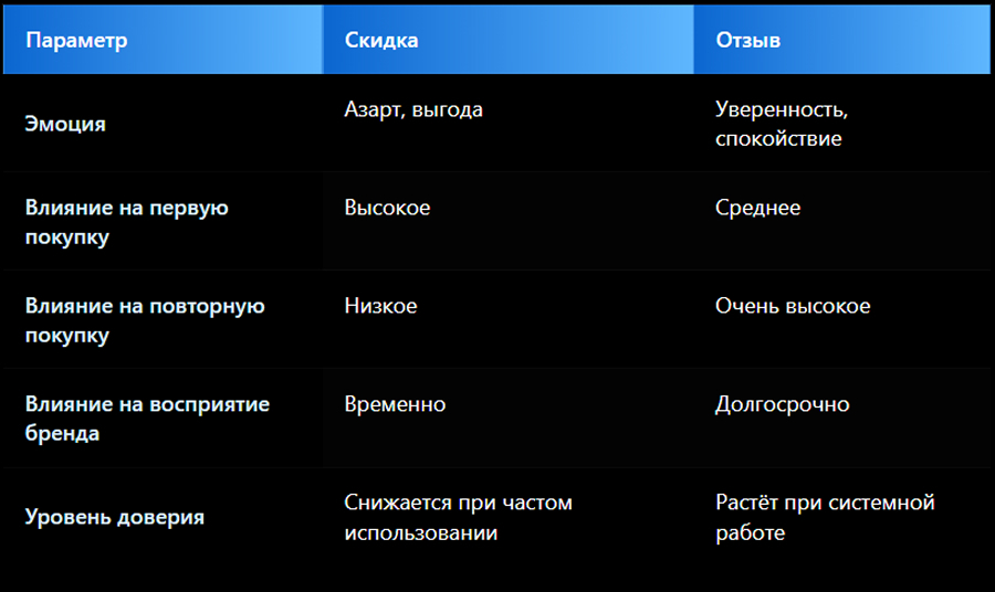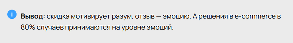 Если скидка — это толчок к действию, то отзыв —обоснование этого действия. В маркетинге их можно и нужно сочетать, но приоритет должен быть понятен.