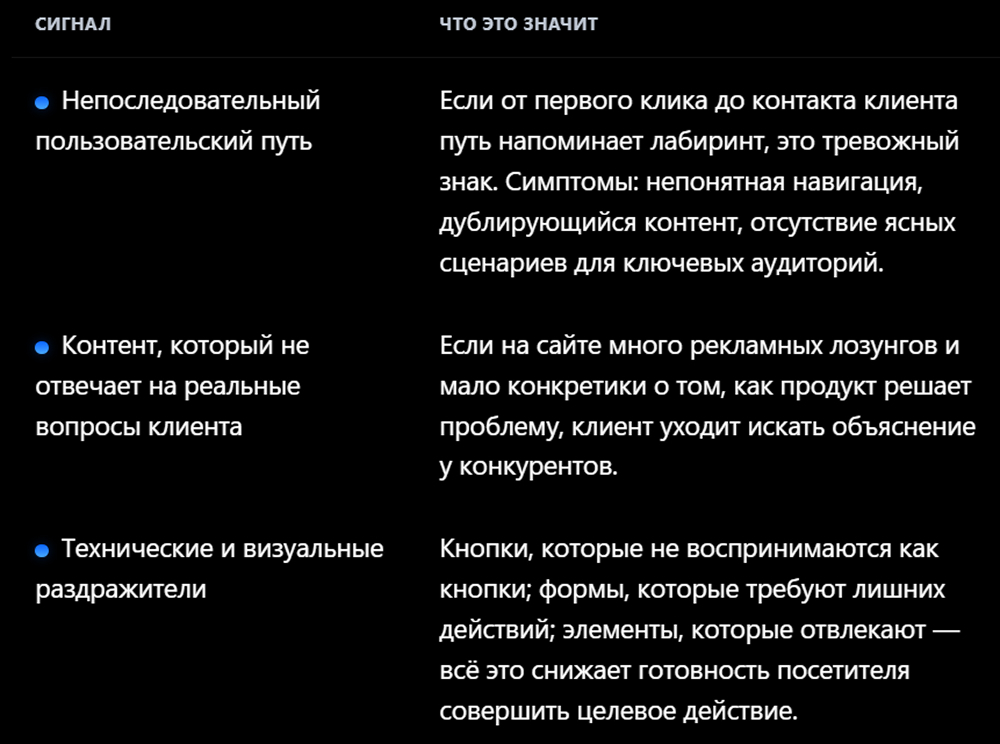 Если объяснение расплывчатое или неуверенное, это сигнал, что сайт не доносит ключевые ценности и усложняет понимание предложения.