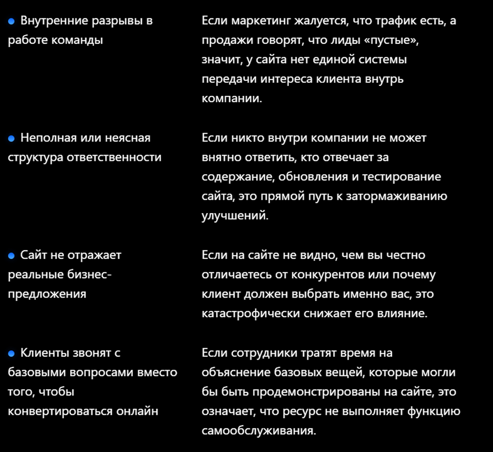 Если информация на сайте обещает одно, а реальный продукт или сервис не подтверждают это, то репутация страдает, а повторные продажи снижаются. Сайт должен честно отражать реальные продукты и услуги компании, чтобы поддерживать доверие клиентов и обеспечивать конверсии.