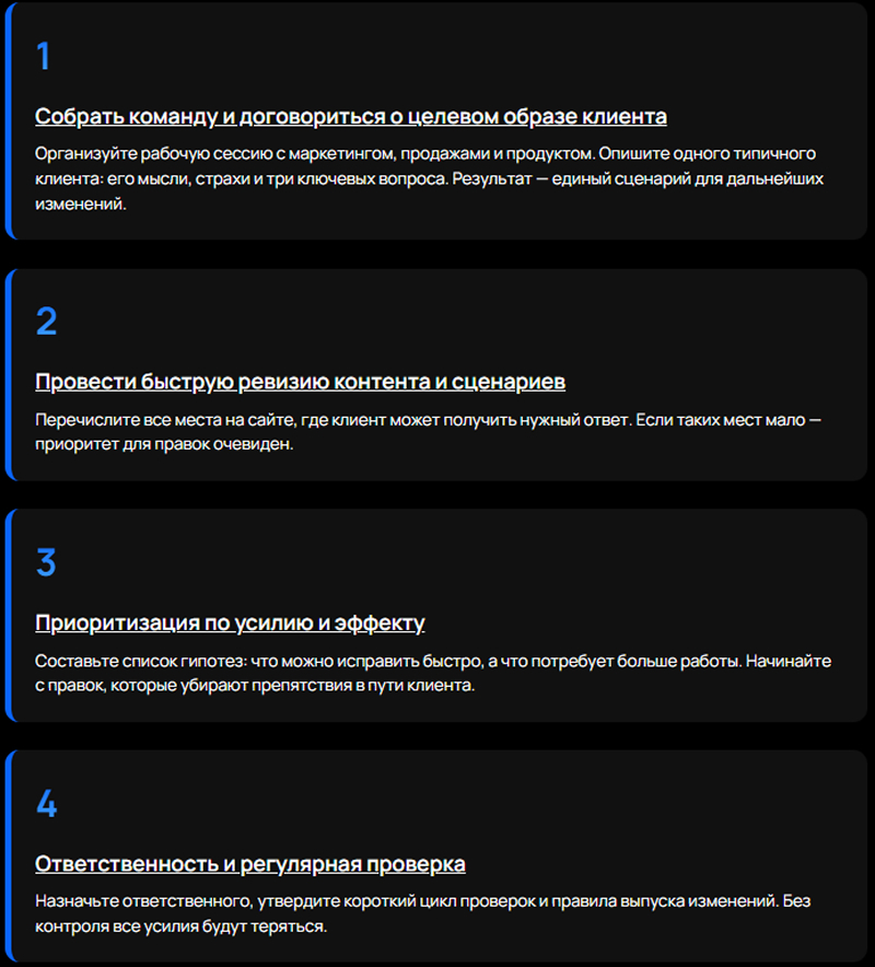 Если вы увидите более одного серьезного препятствия — пора действовать. Назначьте ответственного и начните с правок, которые устраняют основные препятствия на пути первого контакта посетителя с сайтом.