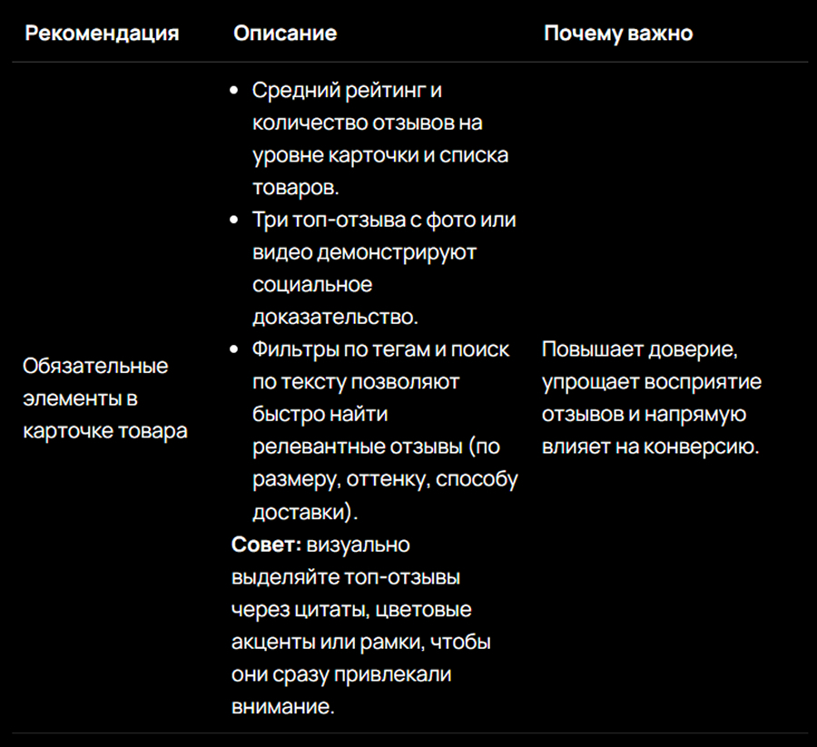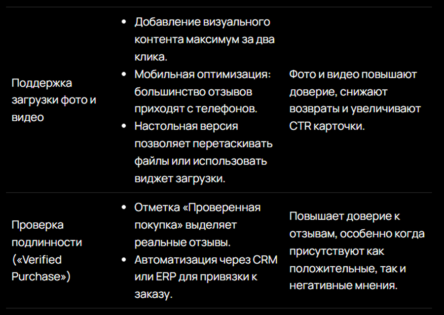 Качественный UGC (фото и видео), удобная форма для оставления отзывов, поддержка мобильных устройств, фильтры, поиск и отметка «Verified Purchase», правильное размещение и грамотная работа с негативом повышают доверие и конверсию. Инвестиции в сбор честных отзывов окупаются через рост продаж и снижение возвратов.