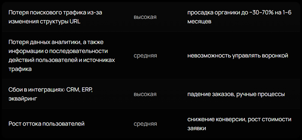 Запуск проекта с нуля почти всегда обходится дороже, занимает больше времени, а также приносит риски: от просадки позиций в поиске и потери собранных данных аналитики до нарушенной логики поведения пользователей и падения конверсий.