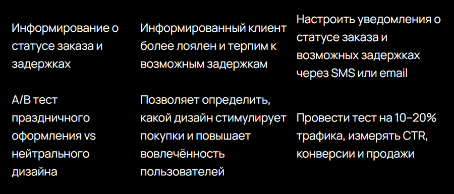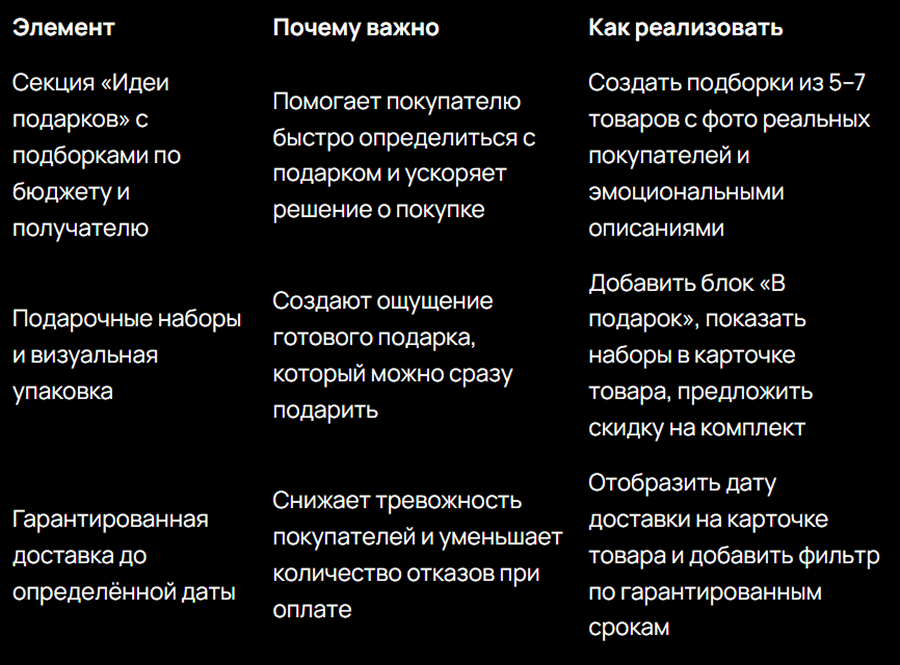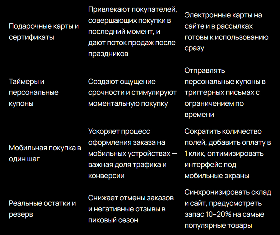 Бесплатная или ускоренная доставка до праздников. Обещание «доставим до 30 декабря» повышает конверсию у нерешительных покупателей. С учётом логистики важно чётко указывать сроки по регионам.