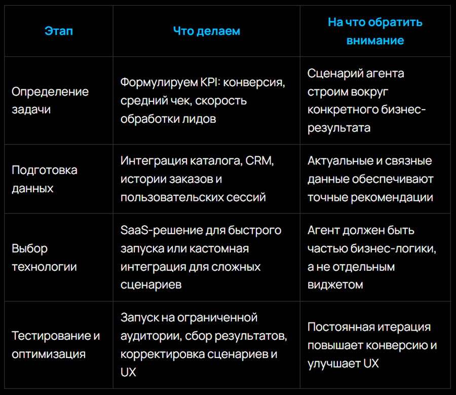 На каждом этапе агент анализирует действия пользователя и адаптирует сценарий под его поведение и намерения, создавая динамичный и персонализированный опыт.