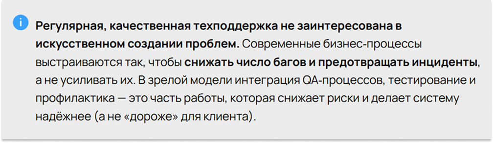 1. Исторический опыт «ремонтной модели». Раньше техподдержку продавали как реактивную услугу: чинить то, что уже сломалось. Проблемы возникали, их исправляли, при этом подрядчик мог не давать проактивных решений. Это формировало впечатление, что разработчик зарабатывает на постоянных исправлениях, а не на стабильности.