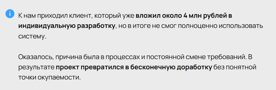 Если этого понимания внутри компании нет, любая доработка начинает превращаться в длительный и дорогой процесс: множатся правки, итоговое решение всё дальше уходит от первоначальной идеи.