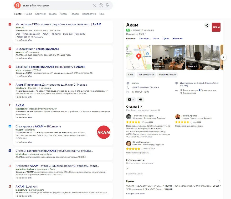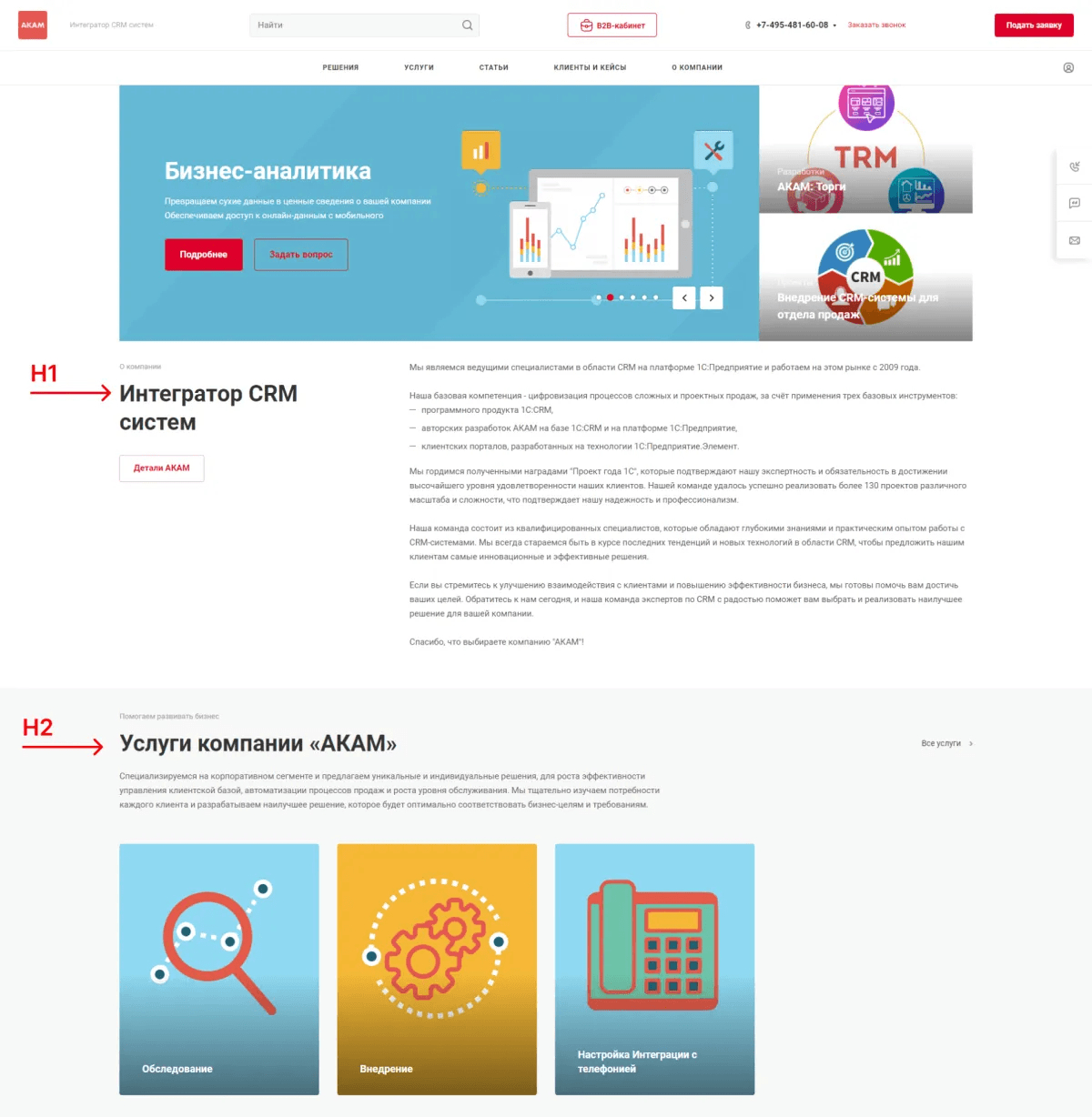 Получить видимость в поиске по запросам, связанным с обследованием, аудитом, внедрением и сопровождением 1С:CRM компании «Акам»