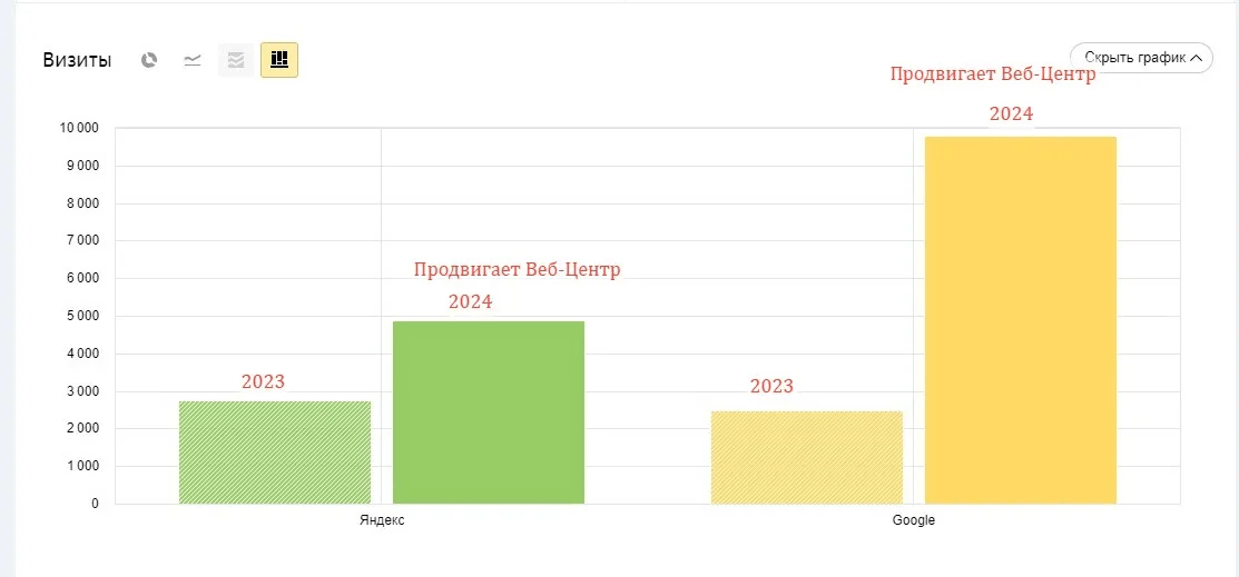 Мы сравнили два периода: 6 месяцев 2023 года без оптимизации и 6 месяцев 2024 года, когда мы работали над продвижением сайта.
