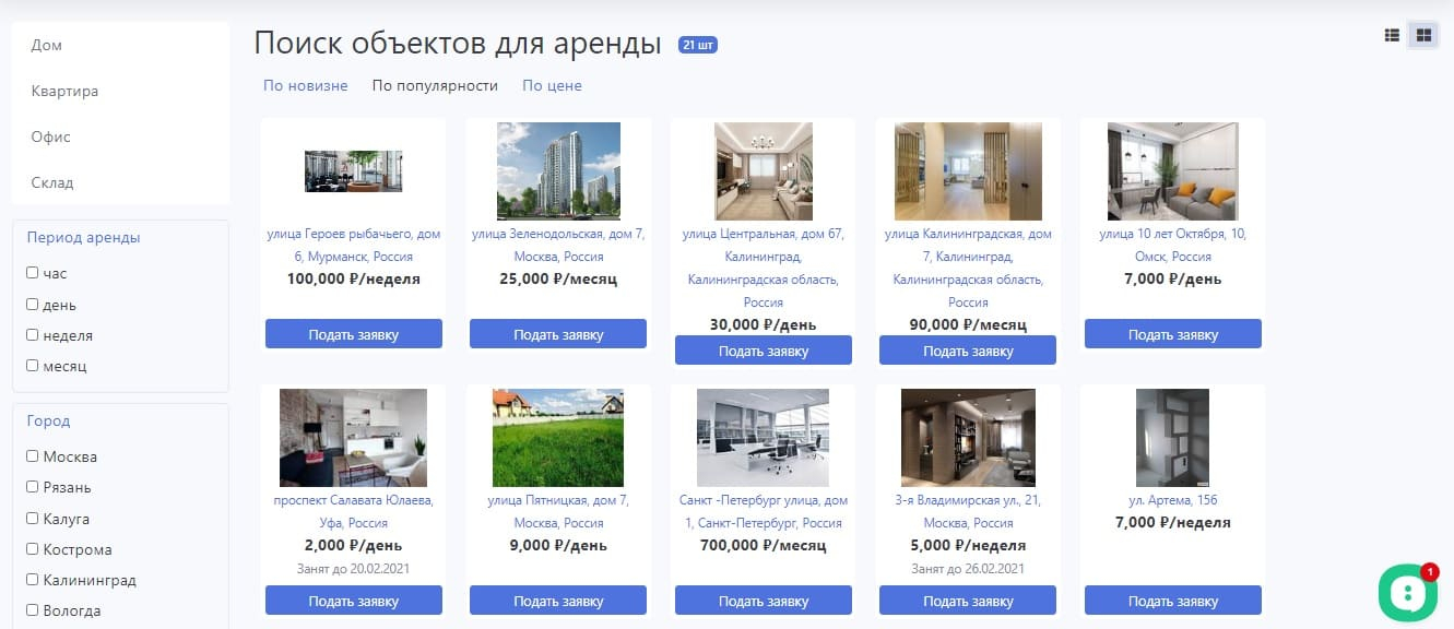 Каталог объектов имеет множество фильтров для удобства поиска. Сортировочные фильтры расположены горизонтально. На левой панели расположен древовидный фильтр с галочками. Подать заявку можно прямо из каталога, не переходя на карточку объекта.
