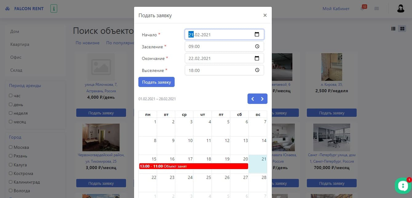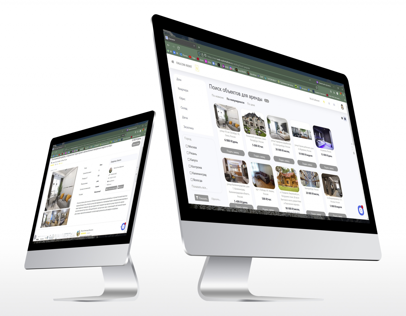 Демо площадки бронирования Falcon Rent создано на примере недвижимости. Но его можно адаптировать для аренды авто, оборудования и других объектов.