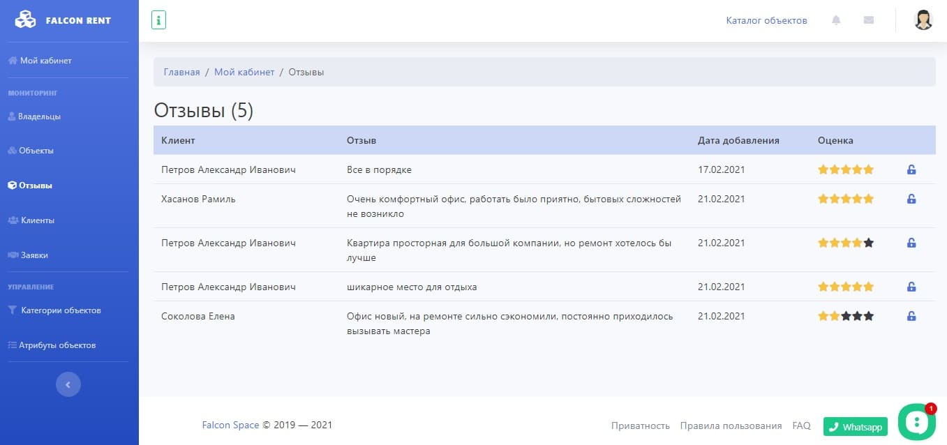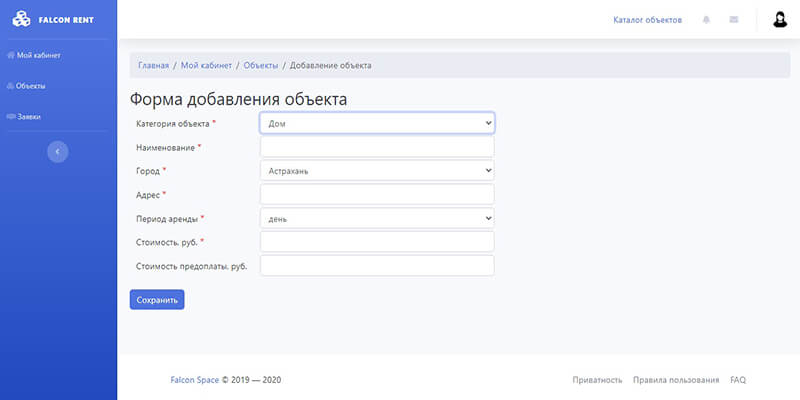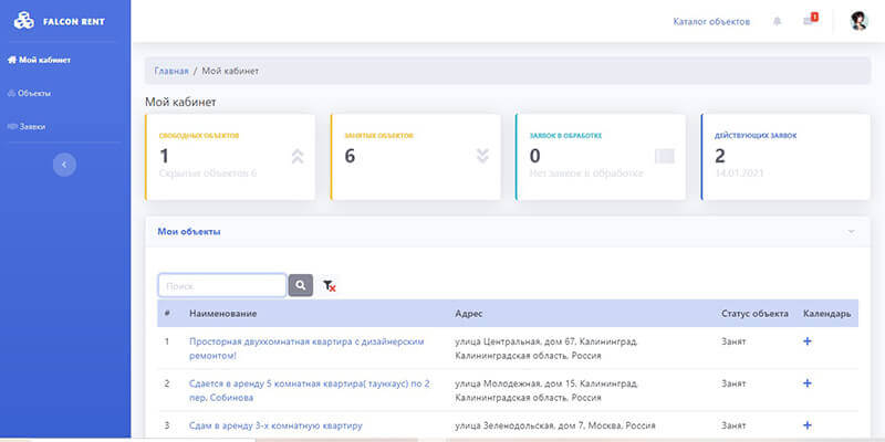 На странице объекты хранится база всех помещений собственника. В любой момент можно добавить объект, которых планируется сдавать в аренду. На странице Заявки будут отображаться все заявки, поданные клиентами на объекты недвижимости Владельца.