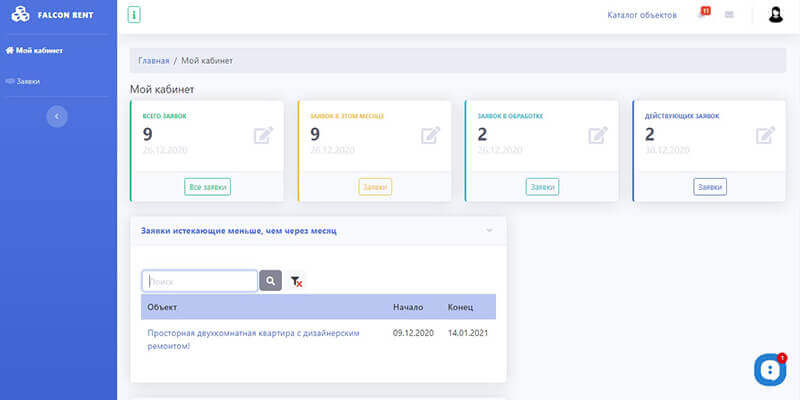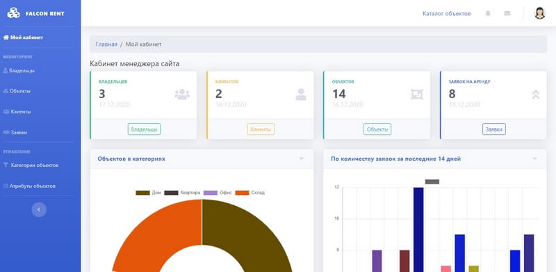 Дашборды на главной странице кабинета сразу показывают количество свободных объектов и арендованных, а также движение заявок.