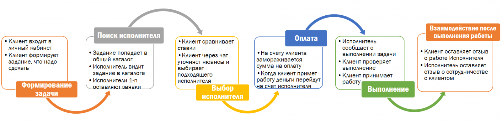 В основе их работы лежит модель аукциона услуг. У клиента и исполнителя свои личные кабинеты. Через них они взаимодействуют друг с другом. Заказчик формирует задачу, которая попадает в общий каталог, который видят исполнители. Они откликаются на задачу и предлагают свою стоимость услуг. Заказчик выбирает среди претендентов подходящего исполнителя и передает задачу ему.