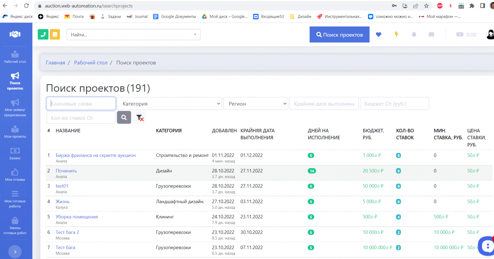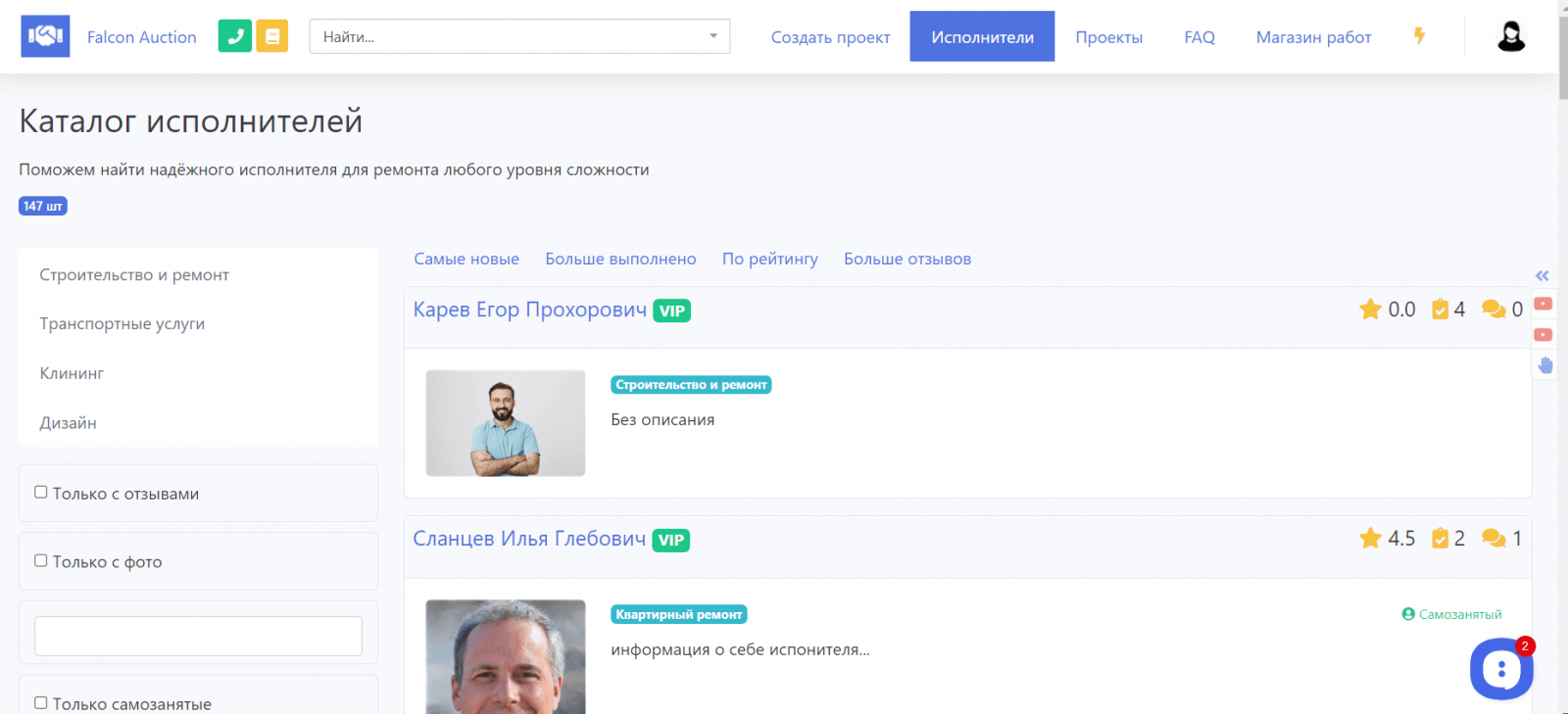 В каталоге есть возможность по категориям и фильтрам самостоятельно найти исполнителя, а можно организовать аукцион на выполнение отдельной задачи или поиск нужного специалиста.
