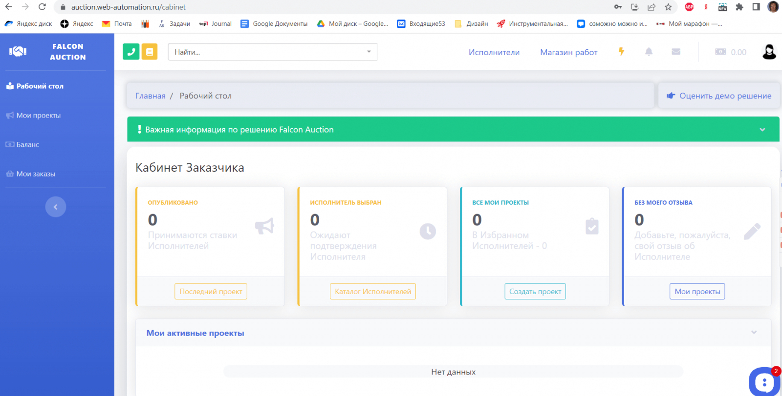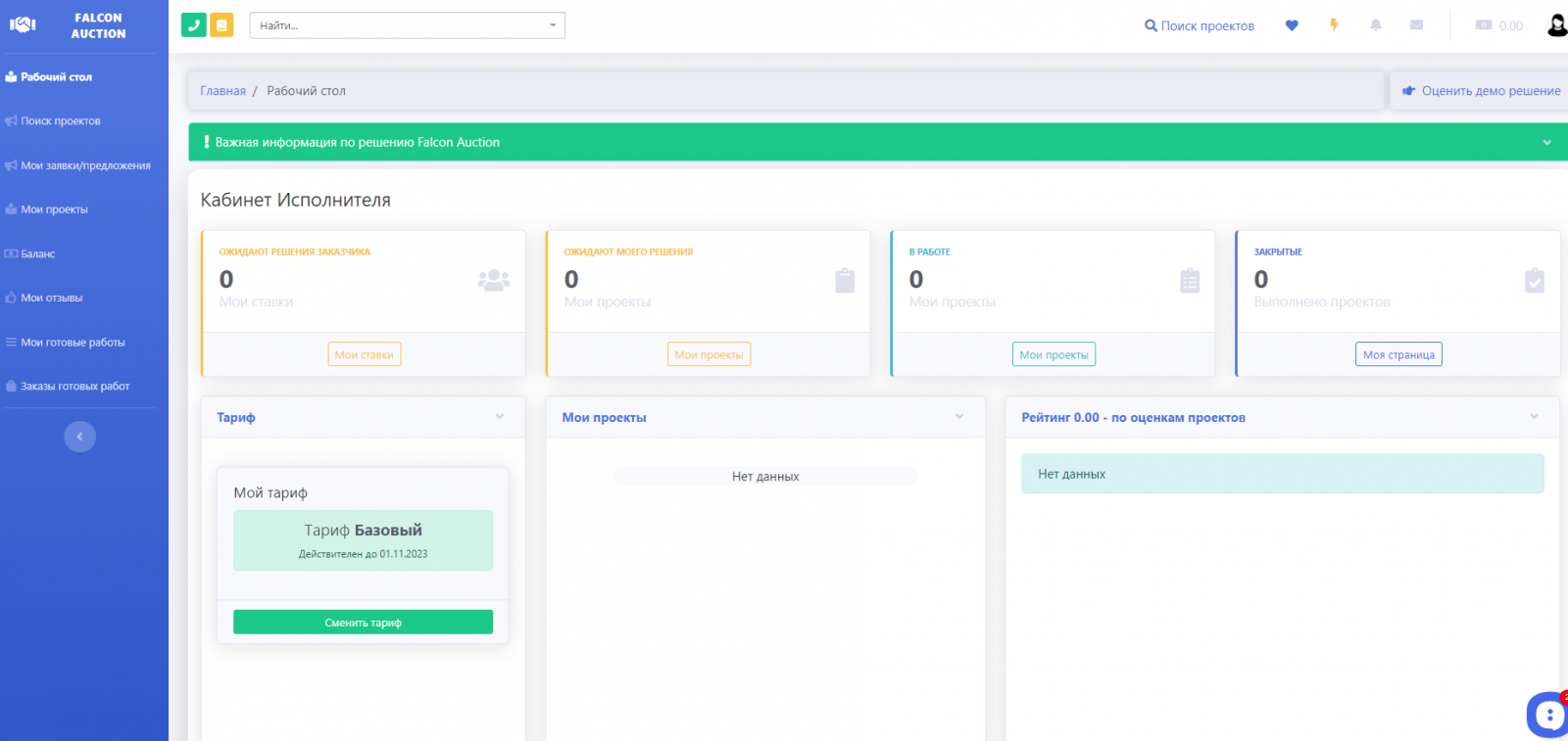 Работа Falcon Auction построена на основе сбора заявок от разных исполнителей на поставленную заказчиком задачу.