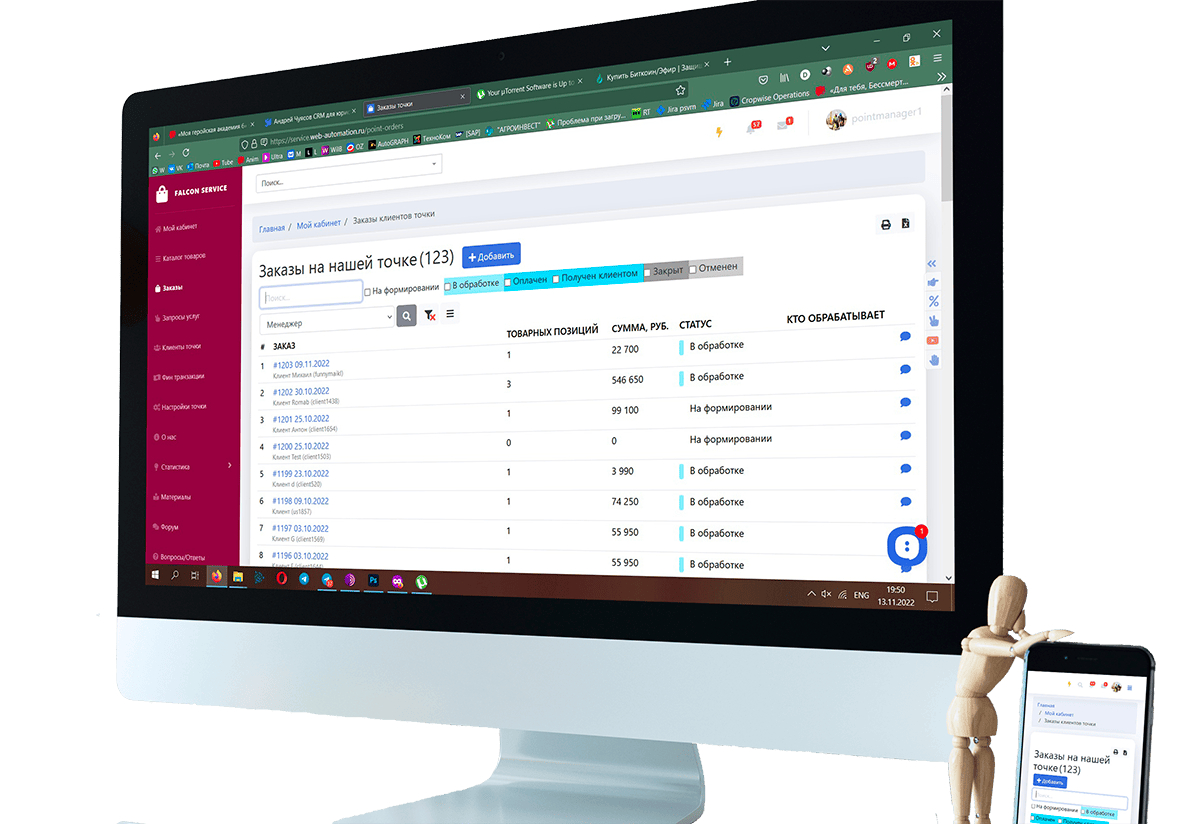 Лучше один раз увидеть, чем десять раз прочитать. Ознакомьтесь с возможностями Falcon Service и узнайте, каков принцип работы CRM с личными кабинетами. Чтобы узнать о возможностях реализации системы производства на заказ на нашей платформе для вашего бизнеса свяжитесь с нашим менеджером.