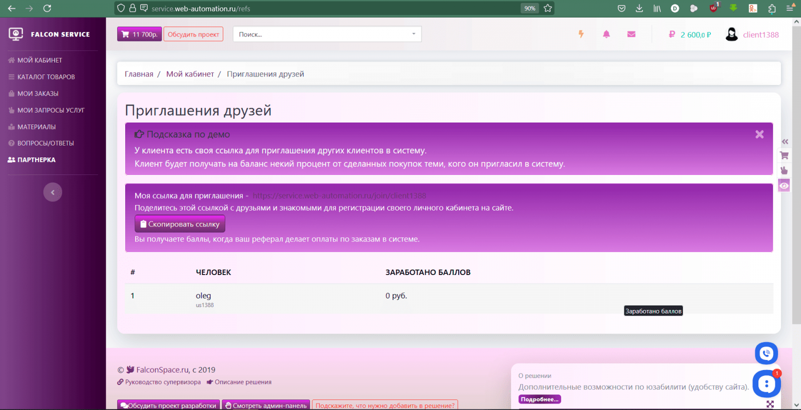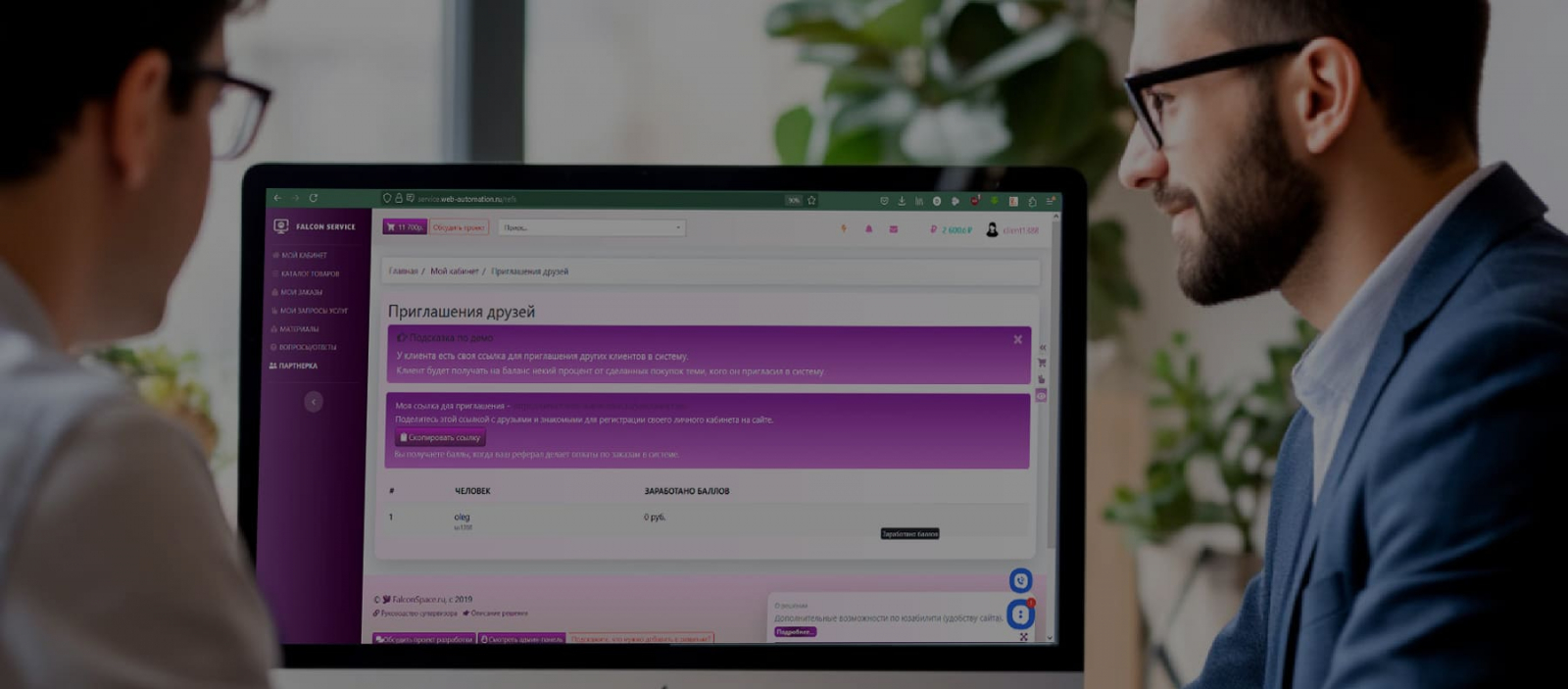 В готовом решении Falcon Service реализована партнерская программы. Она включает: