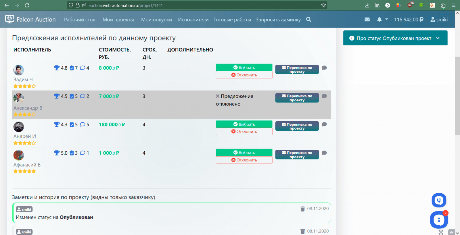 - Заказчики создают проекты. Клиенты описывают свои задачи, а исполнители подают заявки на участие. Затем заказчик выбирает наиболее подходящего кандидата и начинает сотрудничество. Такой подход дает заказчику большую свободу выбора и возможность подобрать исполнителя именно под свои нужды.