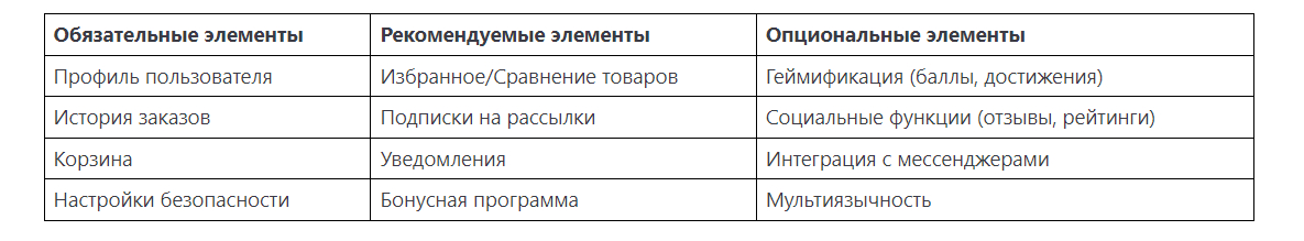 Таблица: Функциональные блоки личных кабинетов на сайте