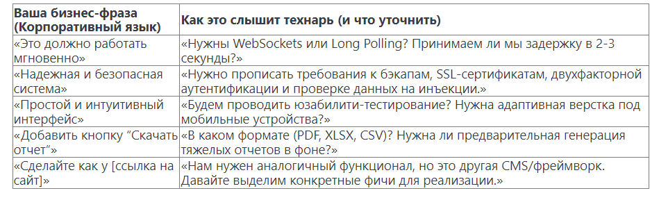 Совет от опытного мнеджера веб-проектов: Самый мощный инструмент в вашем арсенале — глоссарий проекта. Заведите общий документ, где в одной колонке будут «Бизнес-термины», а в другой — «Технические эквиваленты».