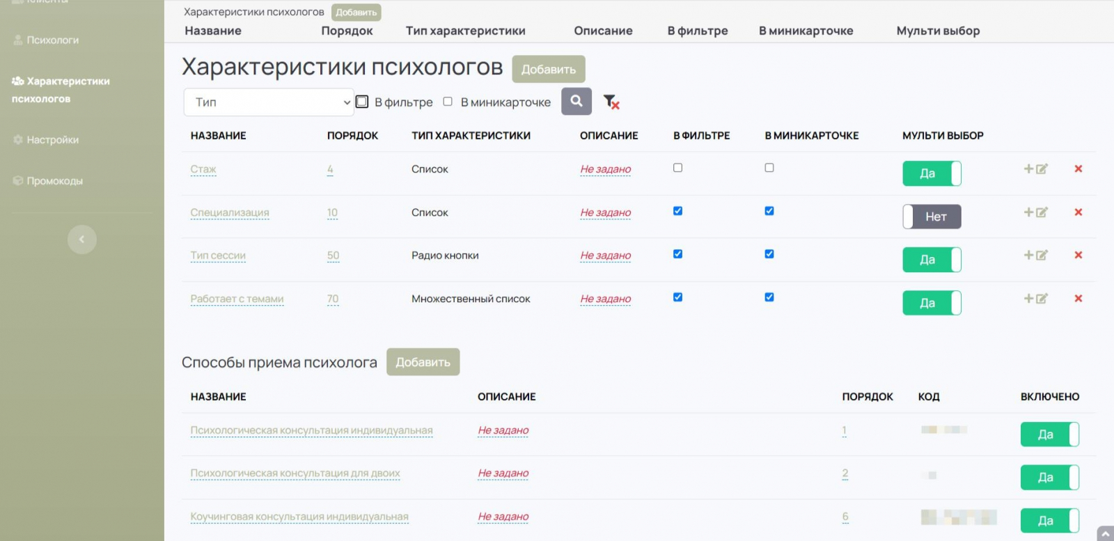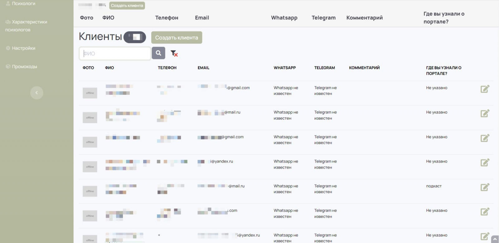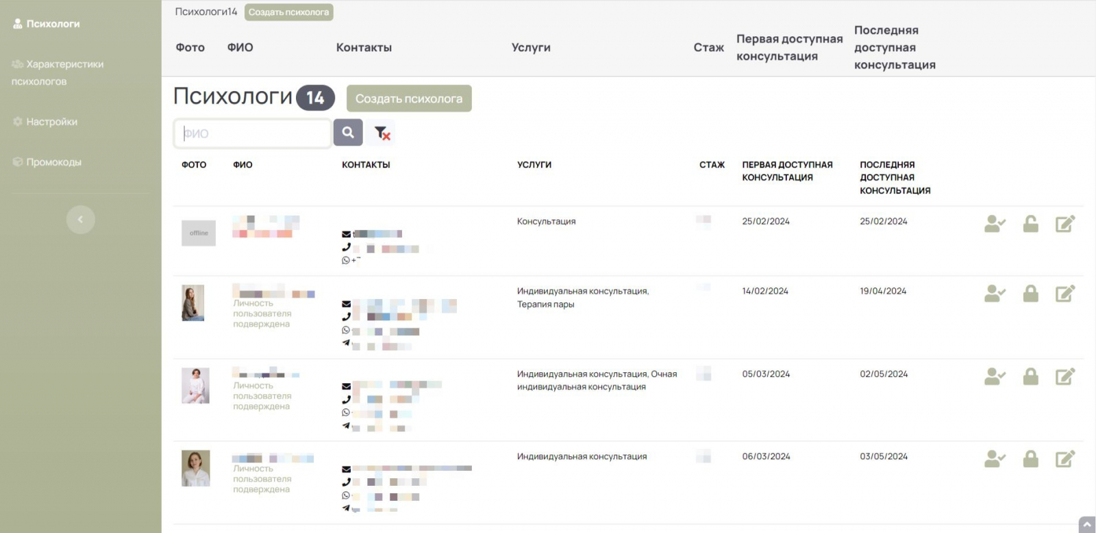 Клиент может записаться к психологу после регистрации личного кабинета, в котором он также сможет отслеживать историю посещений и производить оплату приемов. Каждый психолог через личный кабинет самостоятельно заполняет расписание с доступным временем приема.