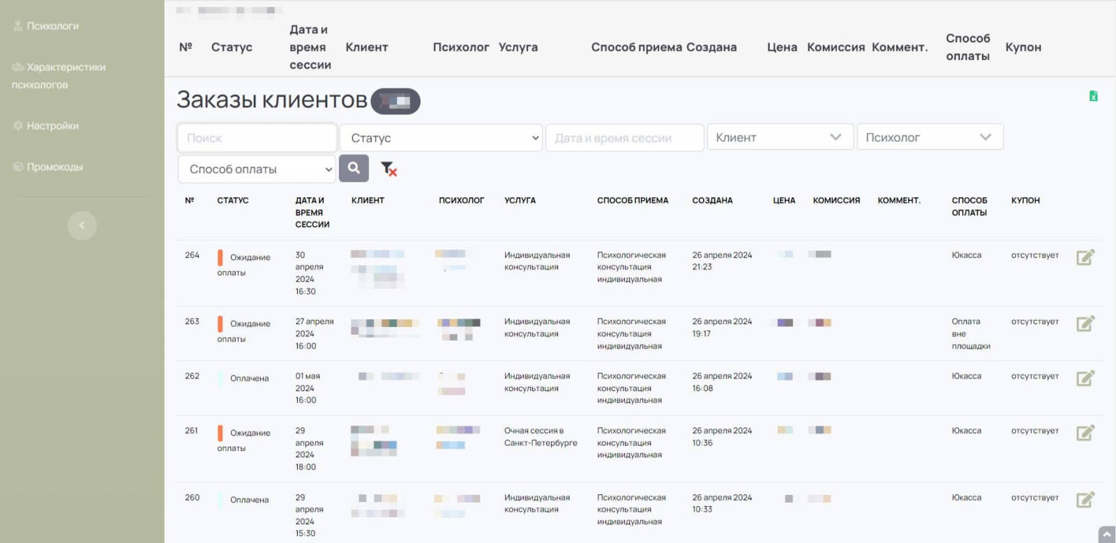 К системе личных кабинетов был подключен механизм сплитования платежей, который позволяет разделять финансовые поступления ( в данном случае - комиссию сервиса и оплату психологам).