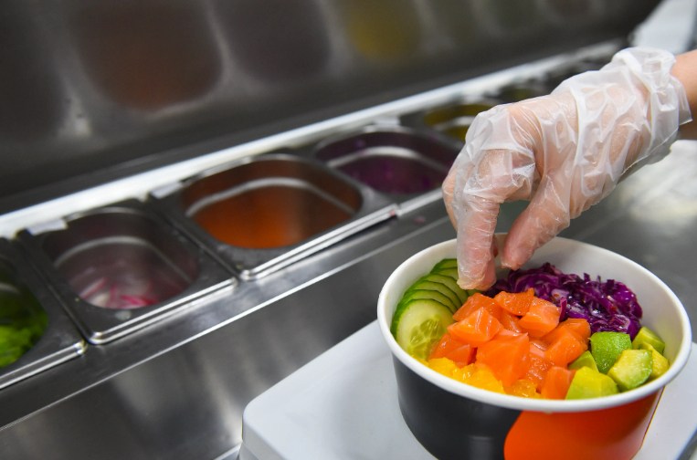 Один из 150 000 поке как раз собирают на кухне. В емкости рис, манго, красная капуста, огурцы, авокадо и лосось. Лосося действительно много.