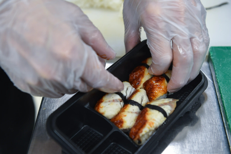 В месяц «Много лосося» использует до 50 тонн рыбы. Впрочем, роллами, поке и суши ассортимент не ограничивается. На этой же кухне пекут и пиццу. Готовая продукция сразу же отдается через окошечко курьерам, ожидающим в специальной комнате.