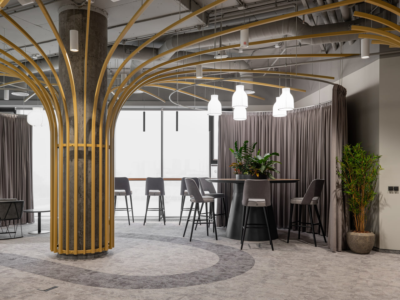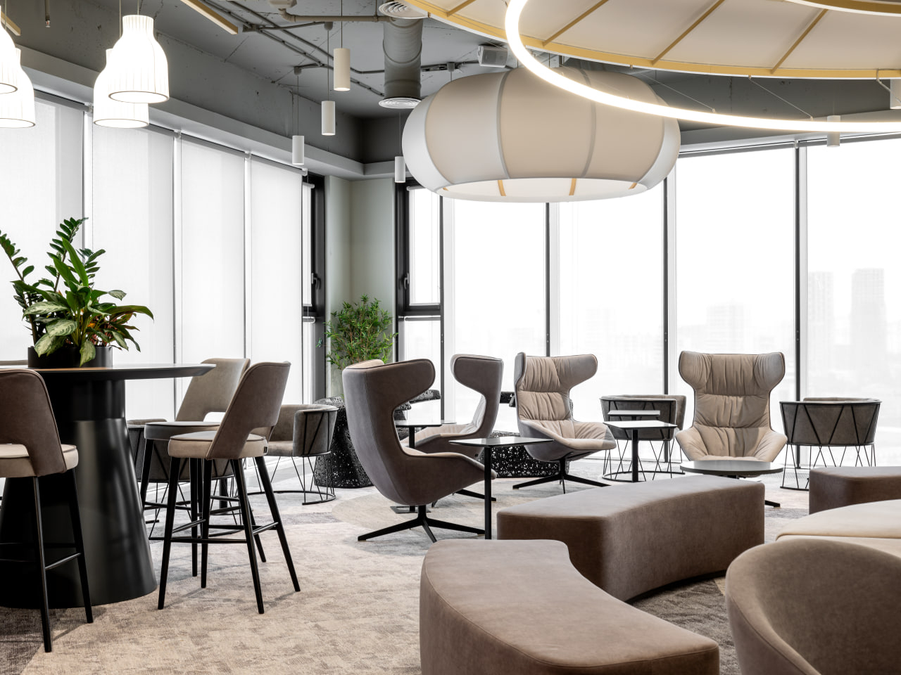 Еще лучше, когда в офисе есть кофейня с профессиональным бариста, как у нас в TheOffice. Людям не нужно самостоятельно варить кофе, чистить кофемашину и мыть посуду. А разместиться можно в комфортабельном лаундже с панорамным видом на реку.