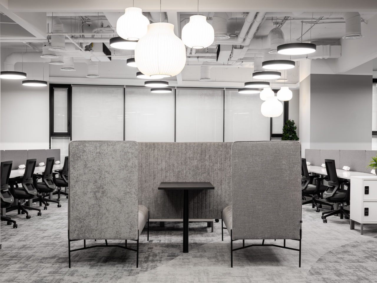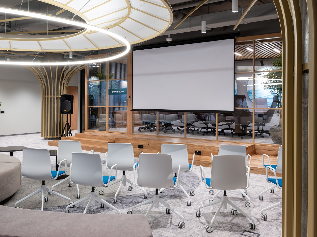 Идеальное место для открытых показов и обсуждения в TheOffice — лаундж. Здесь есть большой проекционный экран и подиум, а мебель можно переставить так, чтобы всем было хорошо видно.