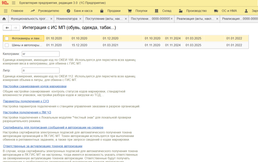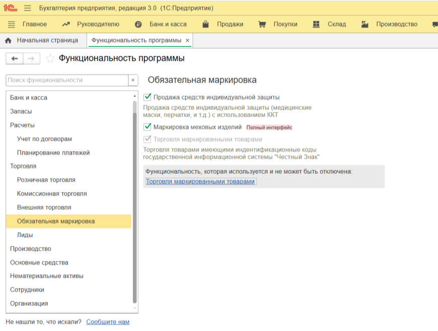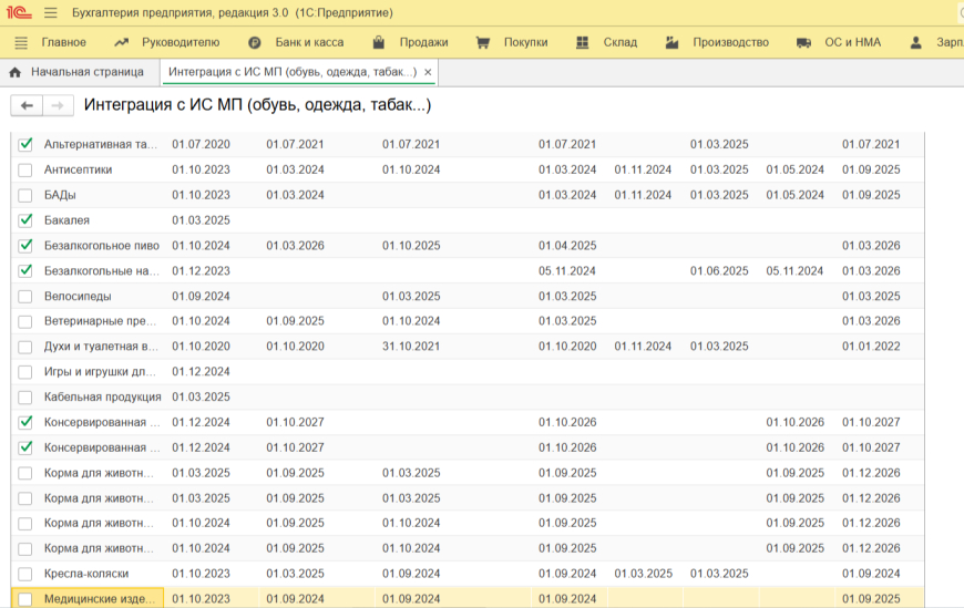 Далее, пройдя по интерактивной ссылке «Торговля маркированными товарами», отметьте те товарные группы, по которым планируется взаимодействие с государственной информационной системой. Также вы можете найти эту настройку через путь: «Администрирование» — «Настройки программы» — «Интеграция с ИС МП».