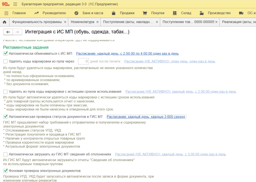 В этом же окне следует настроить автоматическое расписание. Оно будет регламентировать, с какой периодичностью система будет сверять состояние УПД по данным, полученным от ИС (информационной системы).
