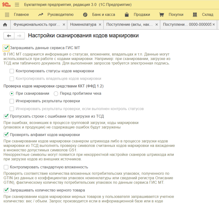 Используйте интерактивную ссылку «Настройка сканирования кодов маркировки», расположенную в той же форме общих настроек. Вам потребуется отметить нужные опции галочками, чтобы настроить процесс сканирования и проверки кодов.