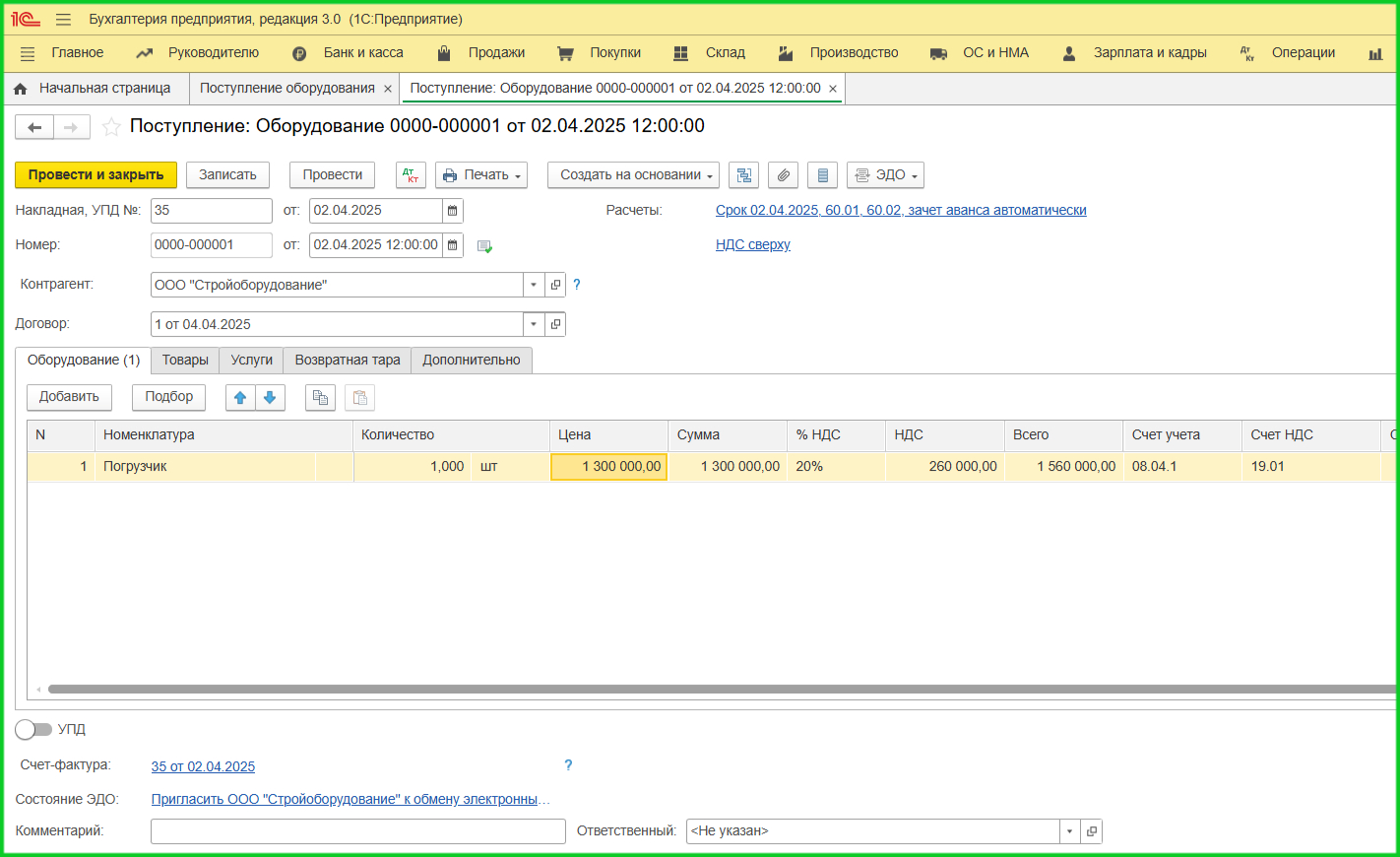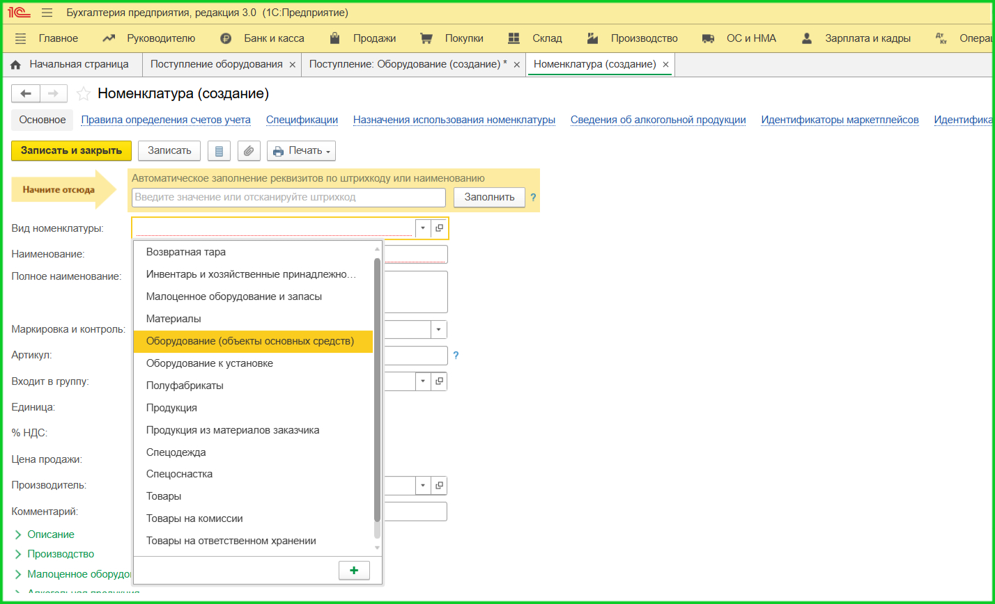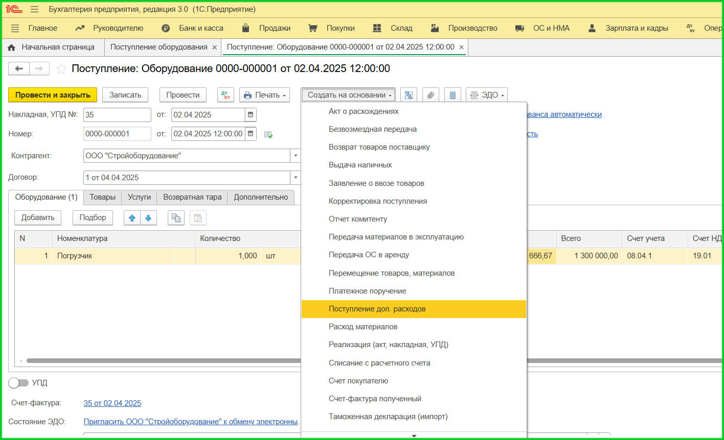 2. Документ «Поступление оборудования». Для объектов с дополнительными расходами используйте вкладку ОС и НМА. Если покупка с НДС, зарегистрируйте счет-фактуру.