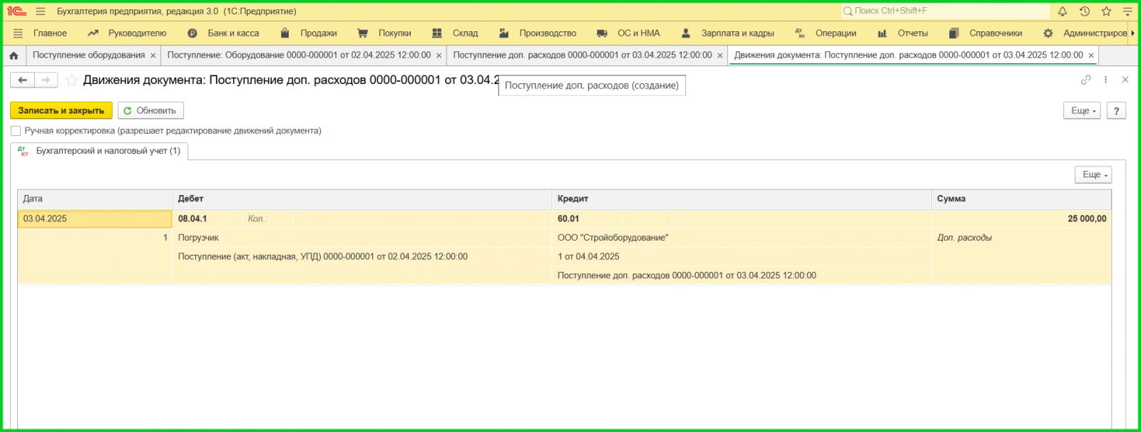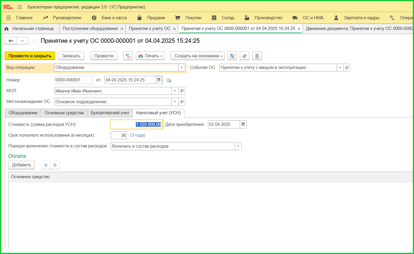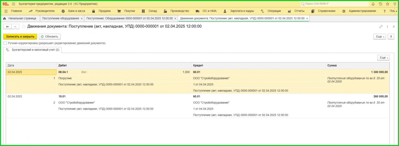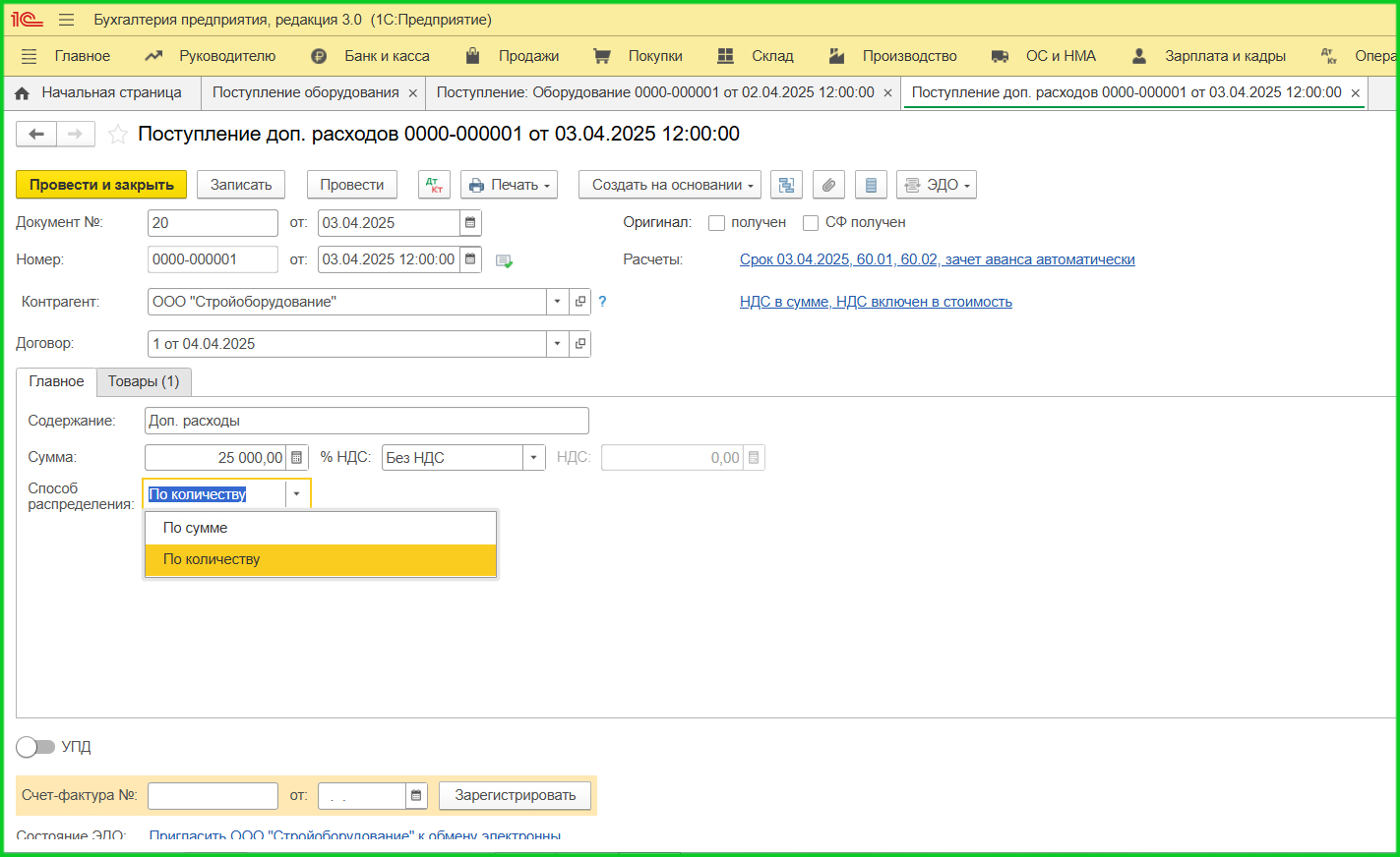 2. Документ «Поступление оборудования». Для объектов с дополнительными расходами используйте вкладку ОС и НМА. Если покупка с НДС, зарегистрируйте счет-фактуру.