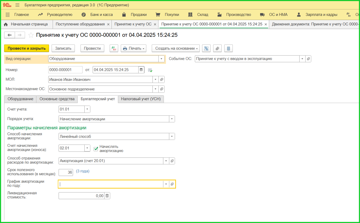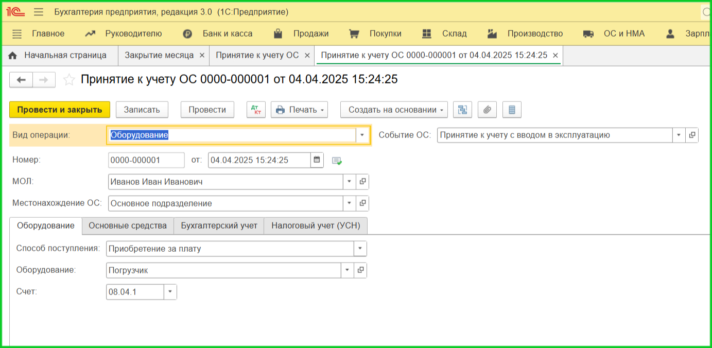 5. Принятие ОС к учету. Раздел ОС и НМА → Принятие к учету ОС: выберите способ учета — просто принять к учету или с вводом в эксплуатацию.