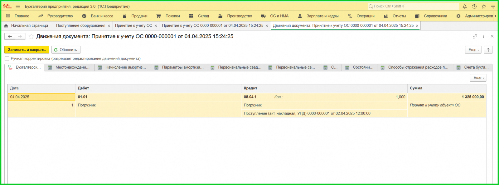 В следующем разделе мы рассмотрим, как организовать учет ОС на примере программы 1С:Бухгалтерия и какие проводки при этом формируются.