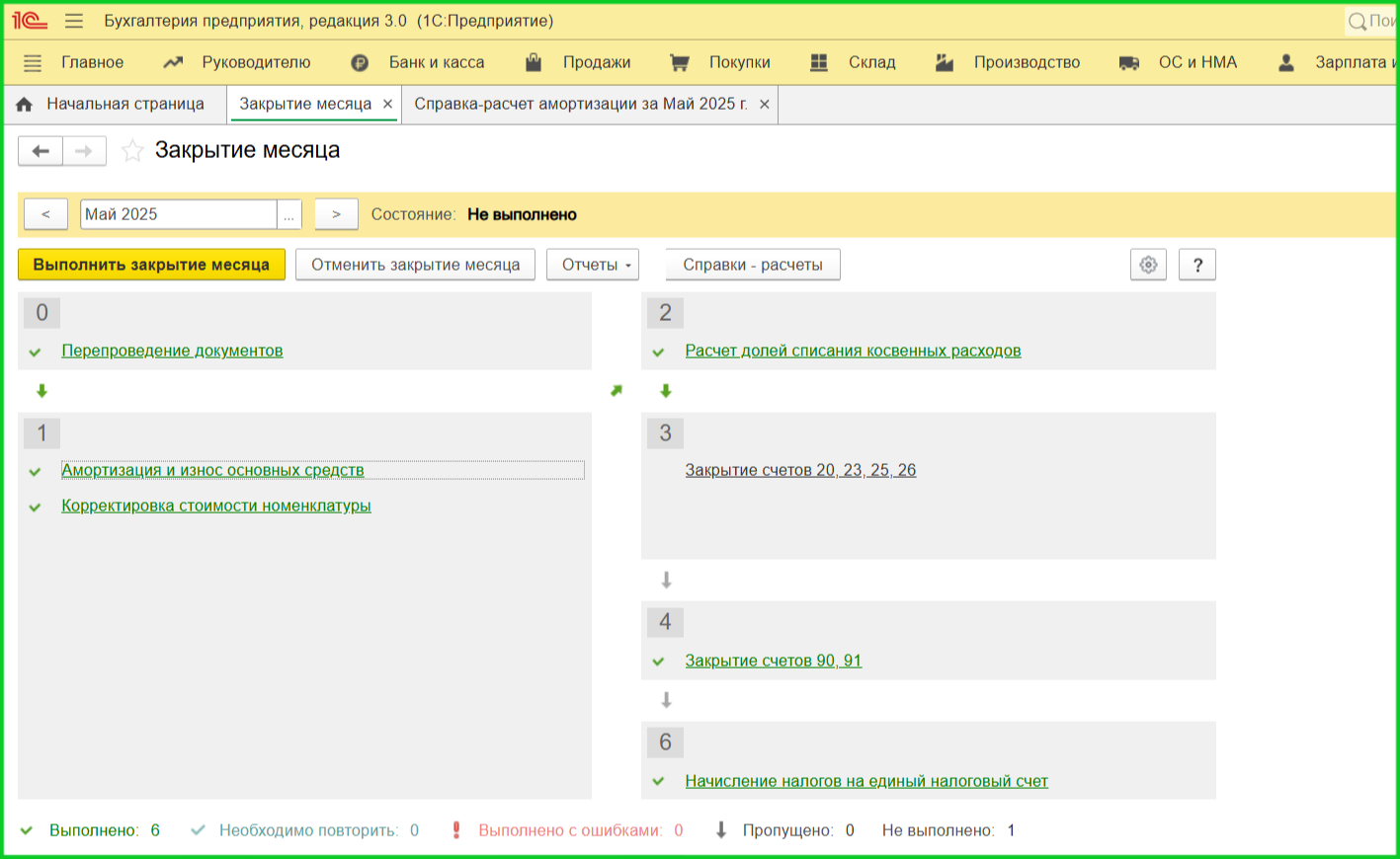 6. Начисление амортизации. Производится с 1-го числа месяца, следующего за принятием к учету. Используйте регламентную операцию Закрытие месяца, затем формируйте Справку–расчет амортизации для проверки начислений.