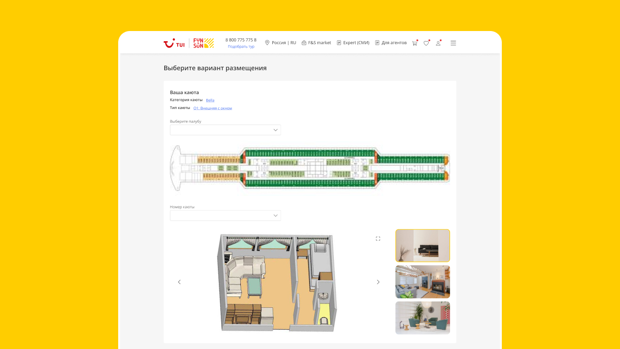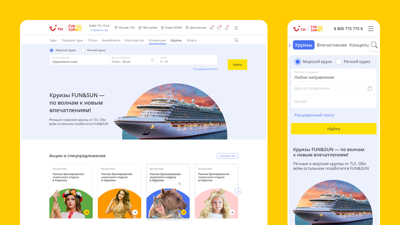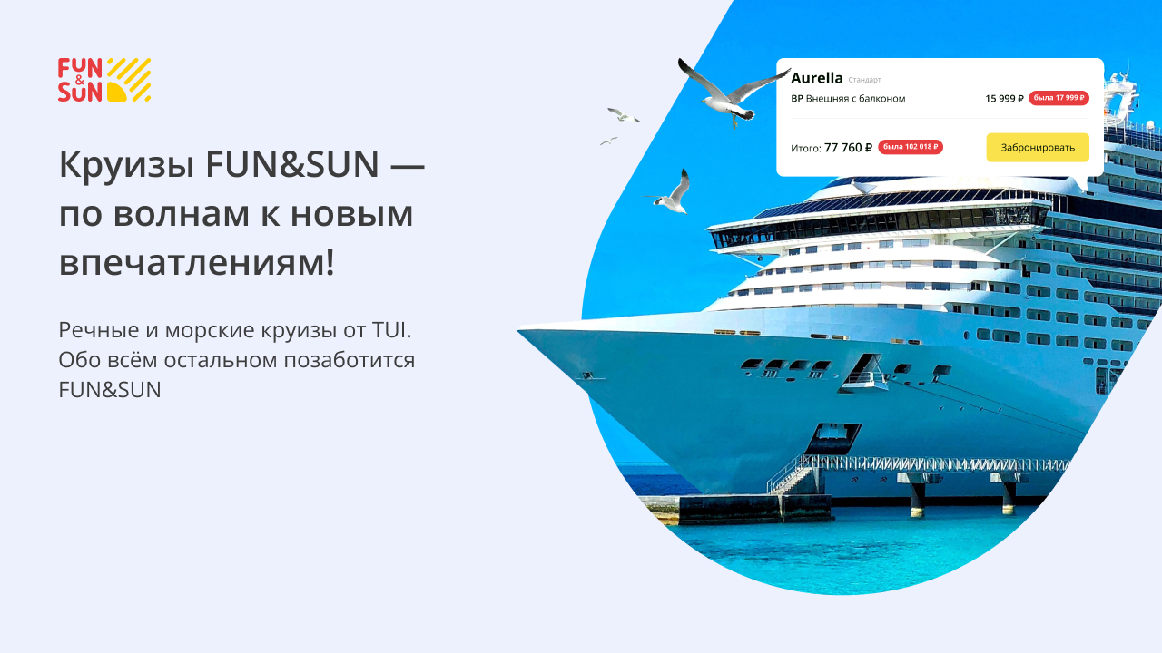 Сайт туроператора Fun&Sun — это уже закрепившийся агрегатор разнообразных способов туризма со знакомым интерфейсом, где в том числе можно купить полноценный круиз по реке или морю во всех ценовых сегментах.
