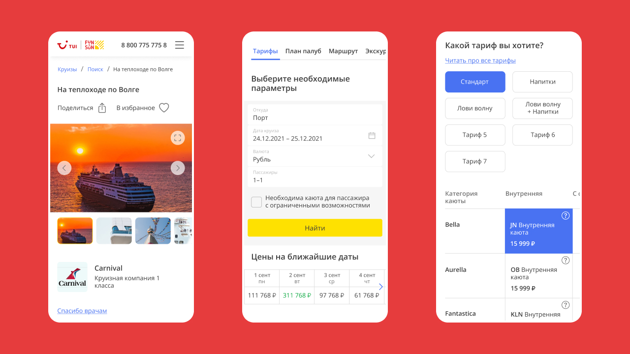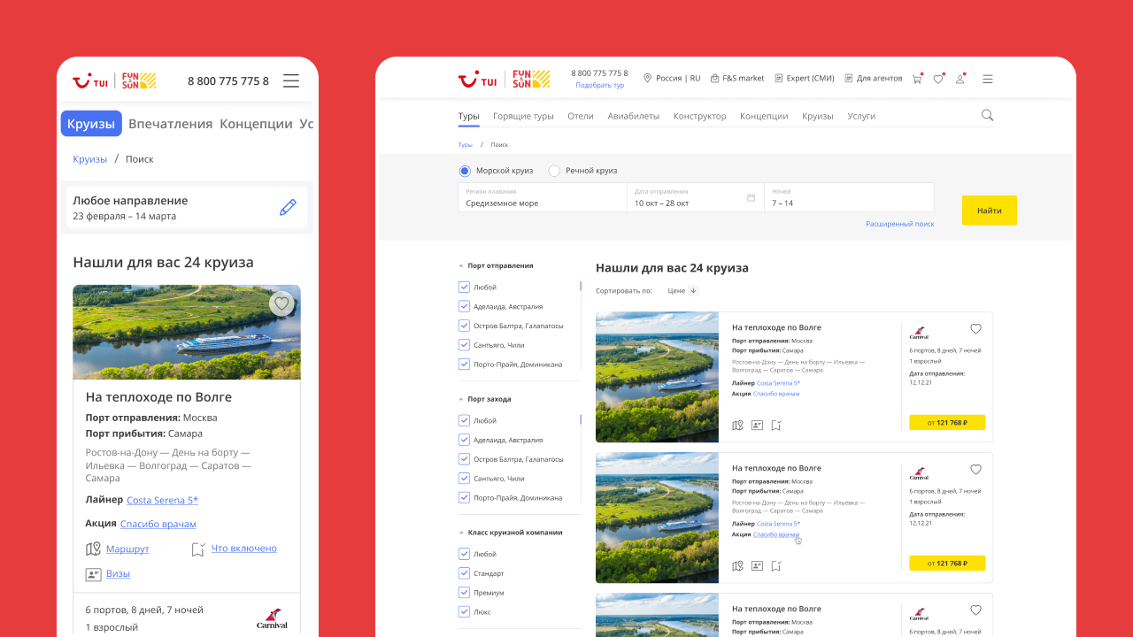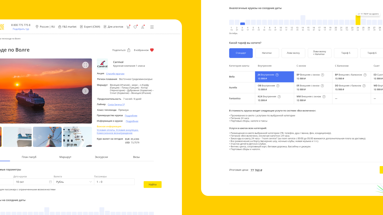 Сроки и бюджет были определены заранее и очень строго. Этот сервис должен был стать новым направлением туроператора и позволил бы пользователям проводить поиск круизов по месту отбытия и прибытия, датам, количеству ночей, каютам и названию теплохода.