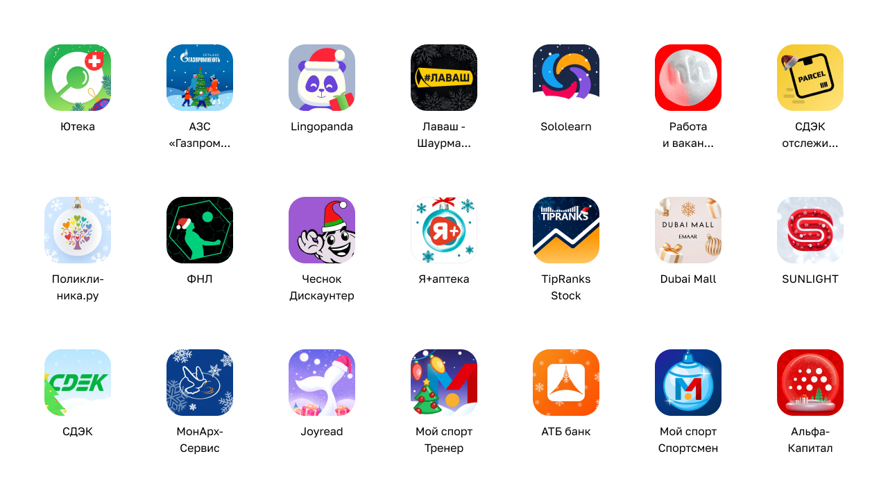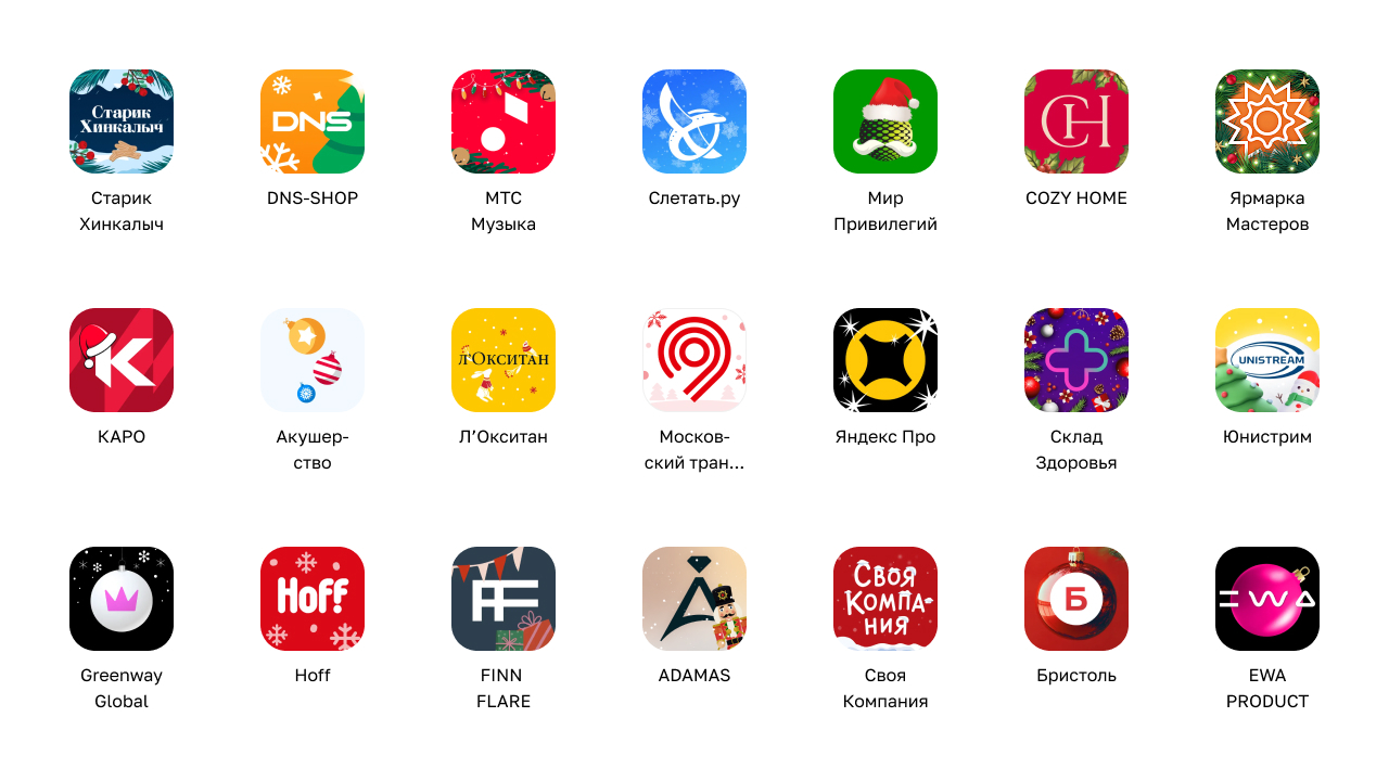 Делаете перестановку каждый год? Многие бренды смело экспериментируют с размером и расположением логотипов, чтобы интегрировать новогодние элементы. Мы насчитали 32 приложения, которые сделали это особенно креативно, добавив персонажей или праздничное окружение.