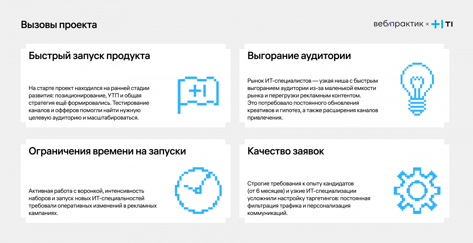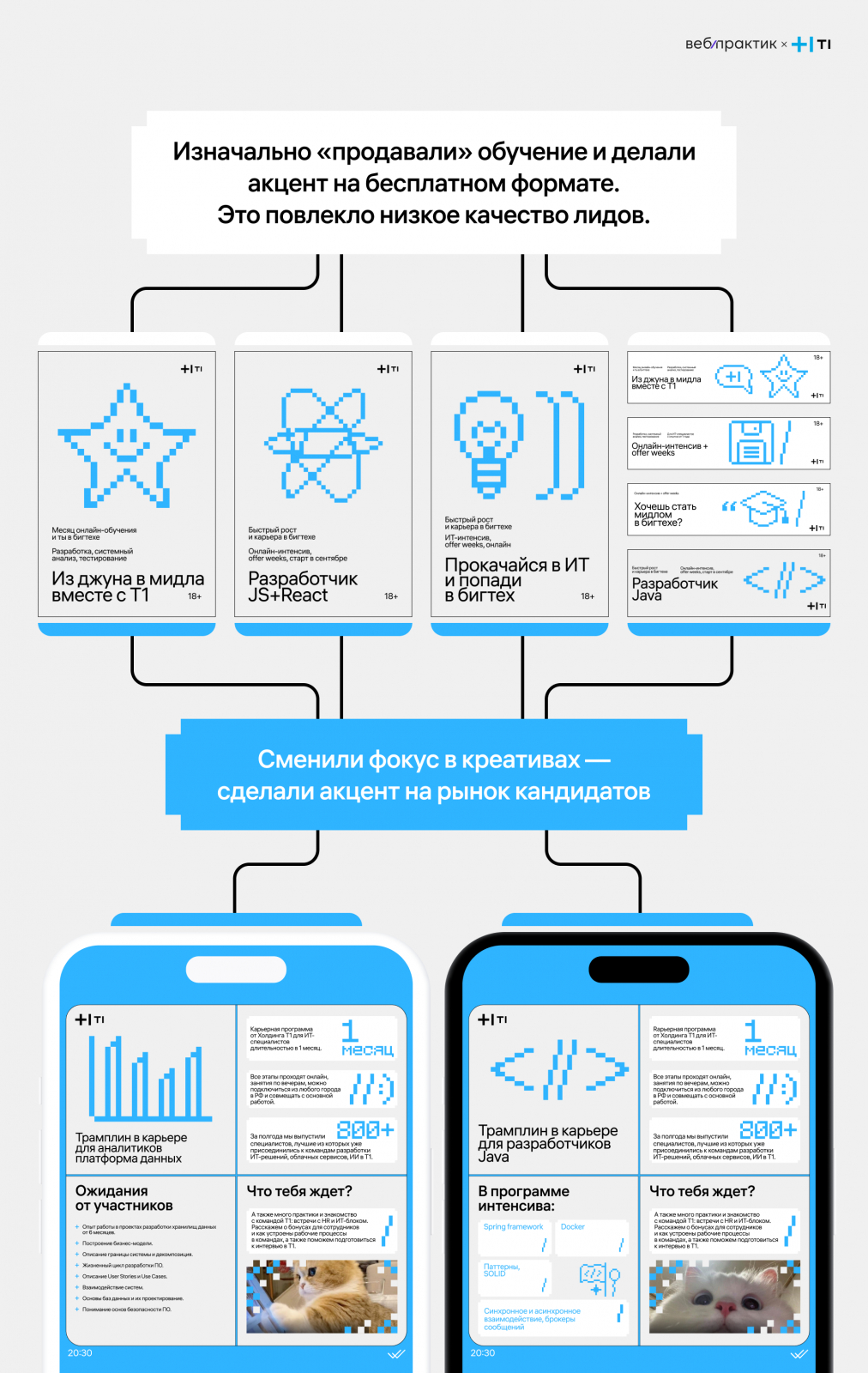 Мы запустили рекламные кампании в нескольких каналах: таргетированная реклама в VK и Telegram, поисковая реклама, а также небольшие спецпроекты. Проект Т1 ориентирован на специалистов с опытом от 6 месяцев и только в определенных ИТ-сферах, что значительно усложняло таргетинг. Дополнительно мешало неочевидное позиционирование: аудитория воспринимала продукт как онлайн-курс, а не как карьерный трек.