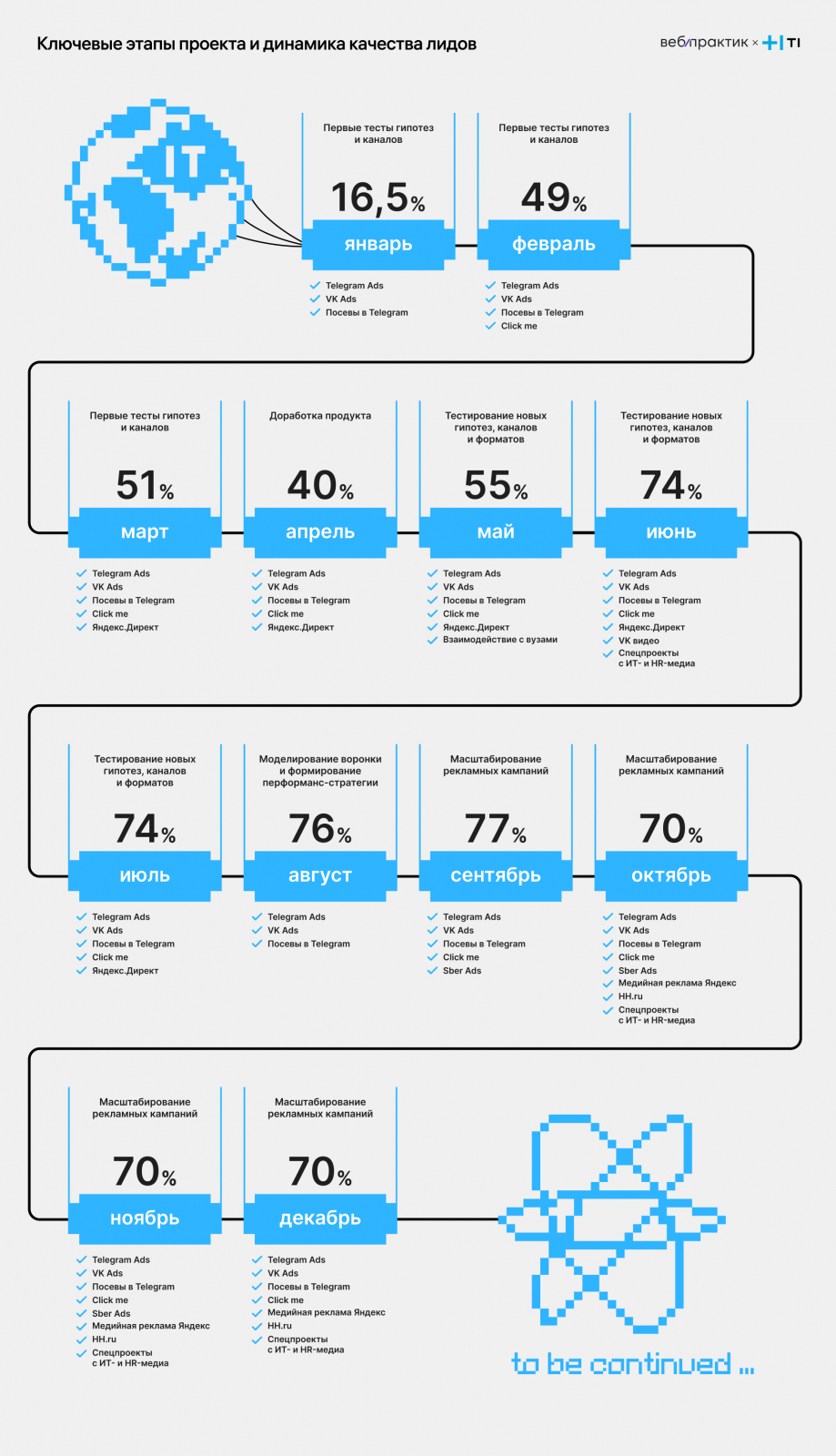 Мы разработали поэтапную performance-стратегию для непрерывного продвижения проекта по привлечению ИТ-специалистов с опытом работы от 6 месяцев: