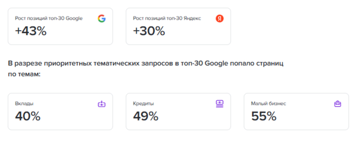 Затем приступили к развитию структуры сайта. Создали новые посадочные страницы под региональные и нишевые запросы, устранили каннибализацию страниц, переработали контент так, чтобы он полностью соответствовал поисковым интентам. Для приоритетных направлений — «Кредиты», «Вклады», «Малый бизнес» — сформировали тематические блоки, охватывающие ключевые запросы максимально полно.