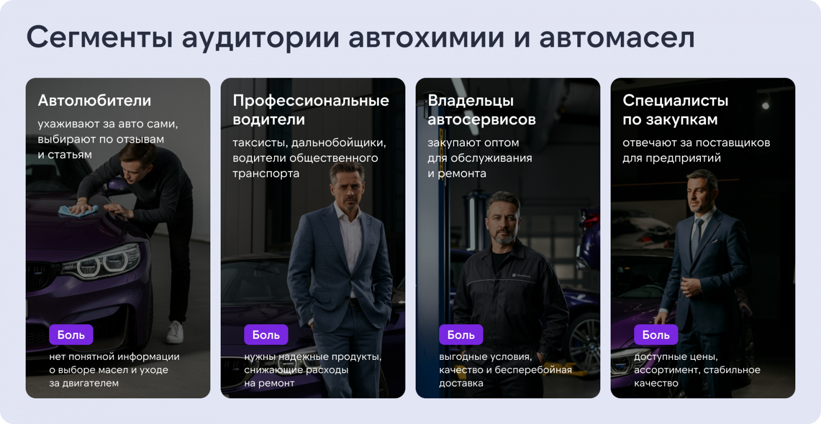 Первый шаг — четко понимать, кто ваша аудитория, где она проводит время, какие у нее интересы и боли. Приведем несколько примеров сегментов из области автомасел.
